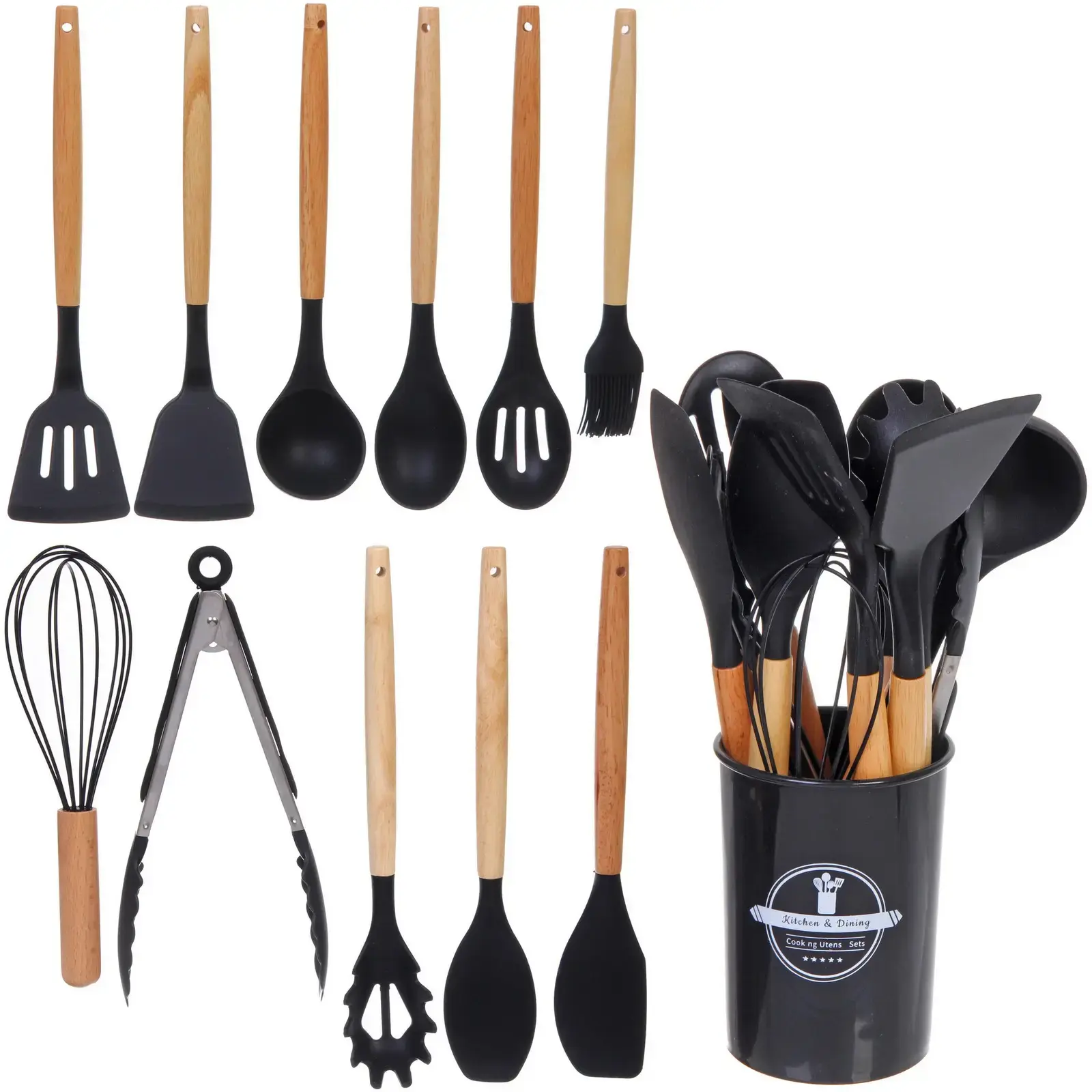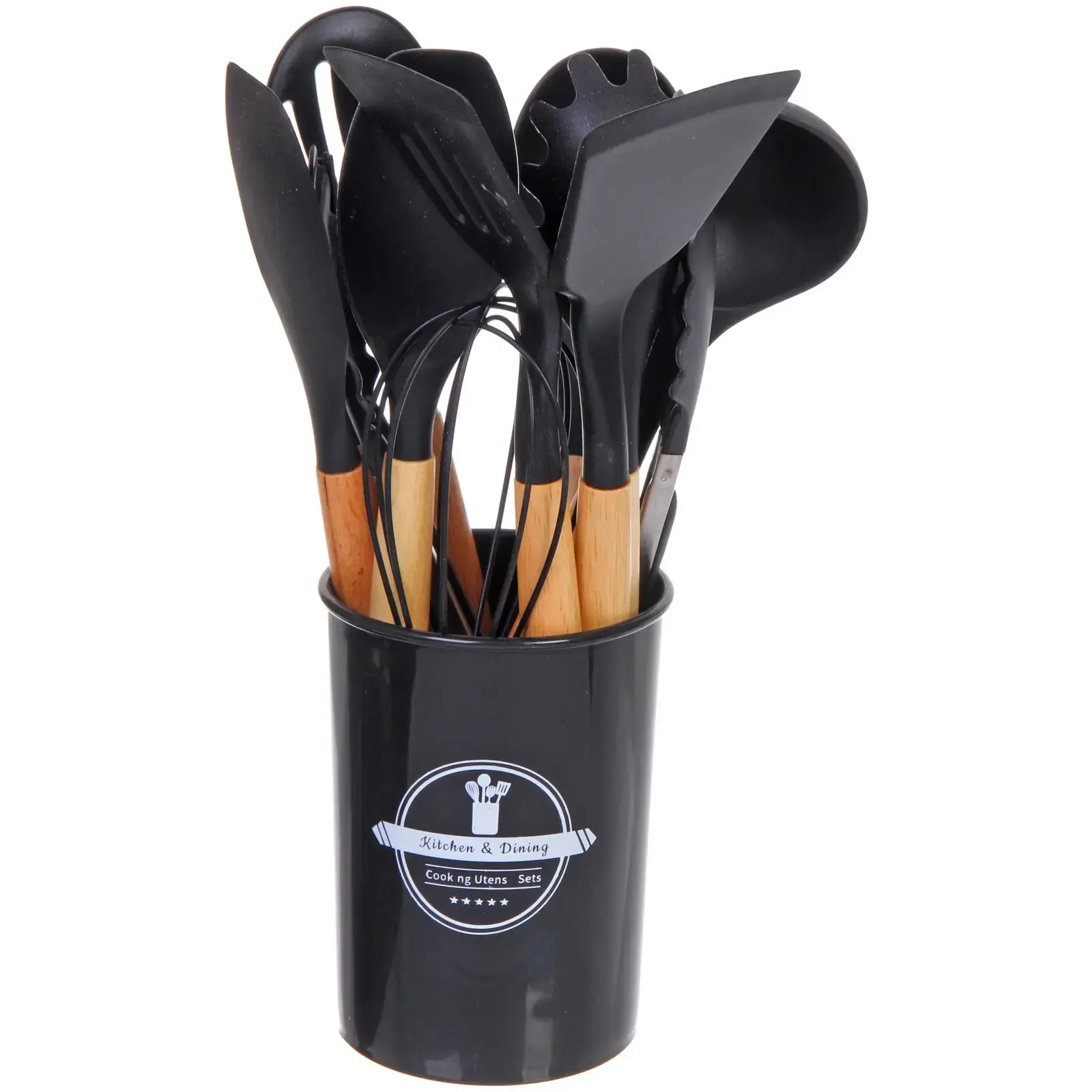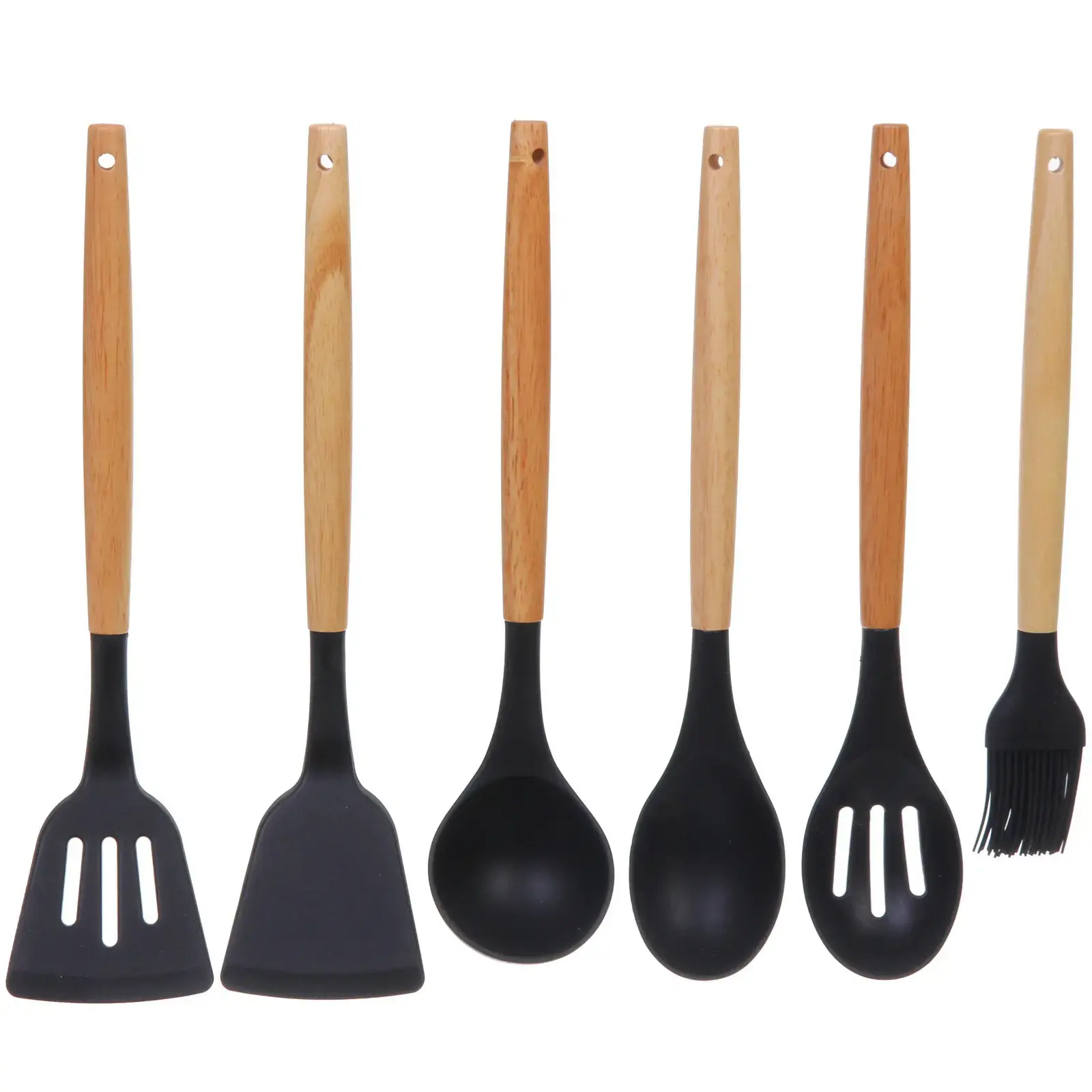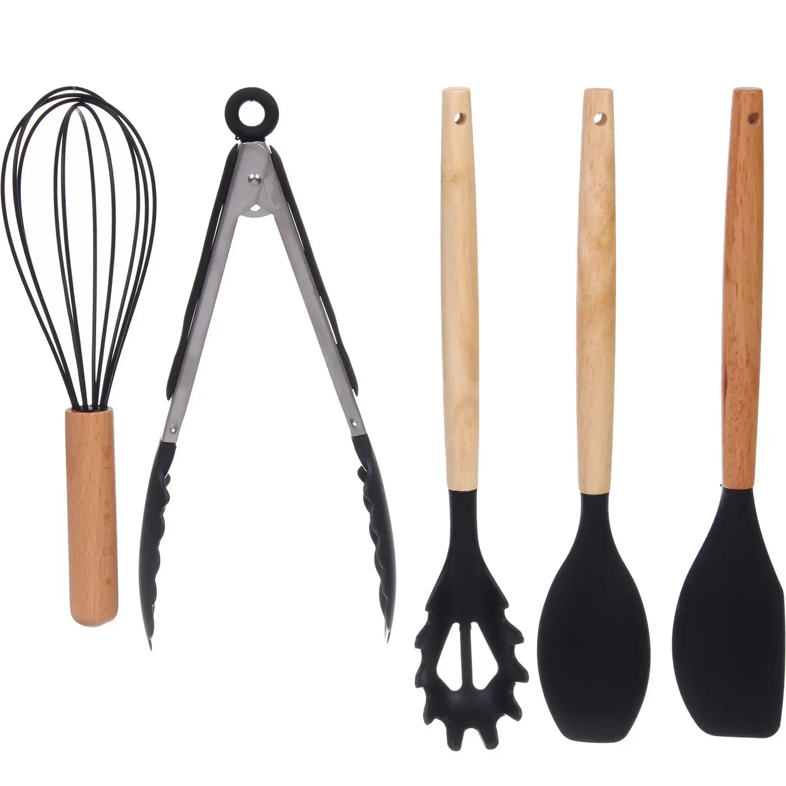 Этот стильный набор кухонных принадлежностей поможет вам не только упростить процесс приготовления блюд, но и сделать его более приятным. Сочетание черного силикона и натурального дерева придаст вашей кухне современный вид, а разнообразие инструментов позволит вам реализовать любые кулинарные идеи.