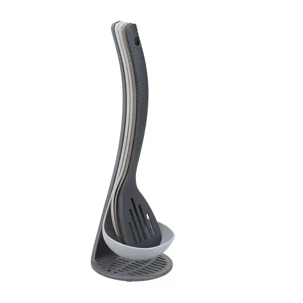 Уникальная конструкция ручек обеспечивает удобный захват, а многоуровневая подставка экономит пространство на рабочей поверхности. Изогнутая форма предметов оптимизирована для работы с глубокими кастрюлями и сковородками. Набор особенно подойдет: