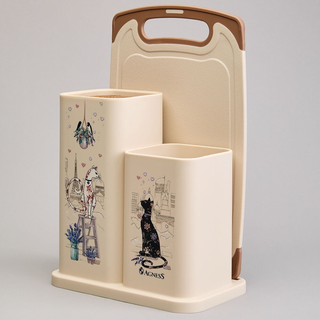 Этот кухонный набор станет незаменимым помощником на вашей кухне, обеспечивая комфорт и стиль в процессе приготовления пищи. Подставка для ножей и разделочная доска выполнены из качественного пластика, что гарантирует долговечность и легкость в уходе. Декоративные элементы с изображениями кошек и архитектурных мотивов добавляют изюминку и создают уютную атмосферу.