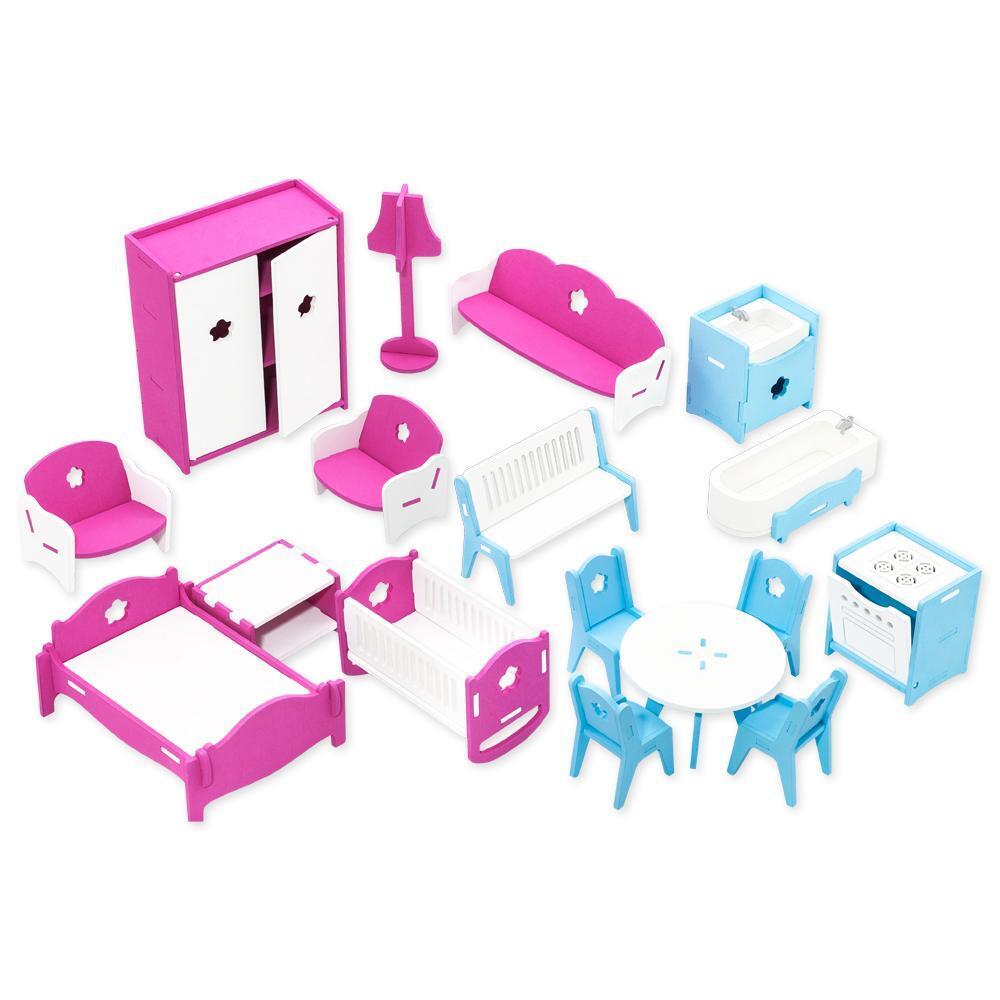 Набор включает 17 предметов, среди которых шкаф, лампа, диван, стулья, стол, кровати, ванна и кухня. Все элементы выполнены из прочных и безопасных материалов, таких как МДФ и фанера, что гарантирует долговечность и надежность. Мебель разборная, что позволяет легко собирать и разбирать ее, а также удобно хранить.