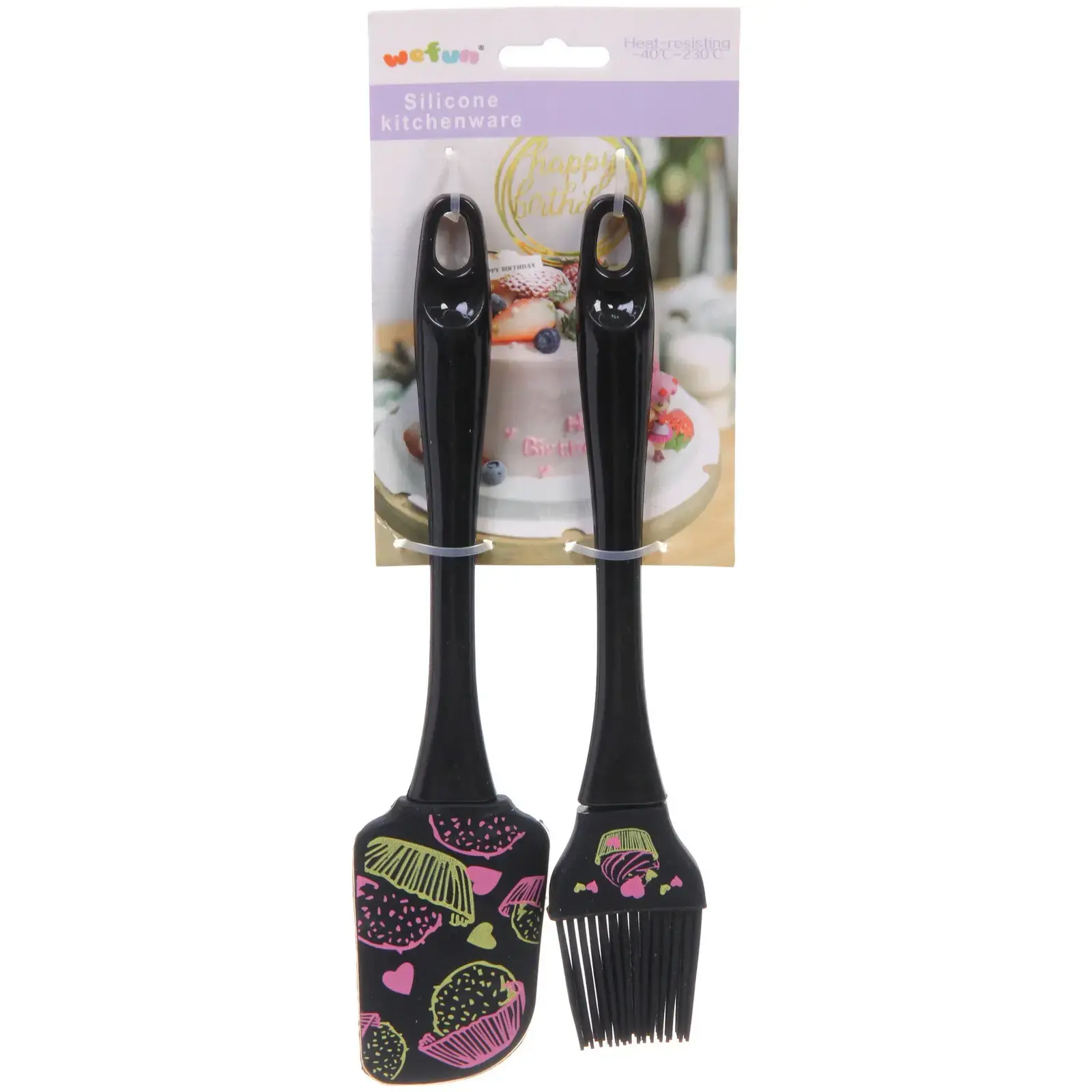 Лопатка и кисточка имеют черный цвет с ярким узором, что делает их стильными и современными. Упаковка набора оформлена в светлых тонах с фиолетовой верхней частью и праздничной надписью «Happy Birthday», что делает его отличным подарком для любителей кулинарии. Набор удобно хранить и транспортировать благодаря резинке, фиксирующей упаковку.