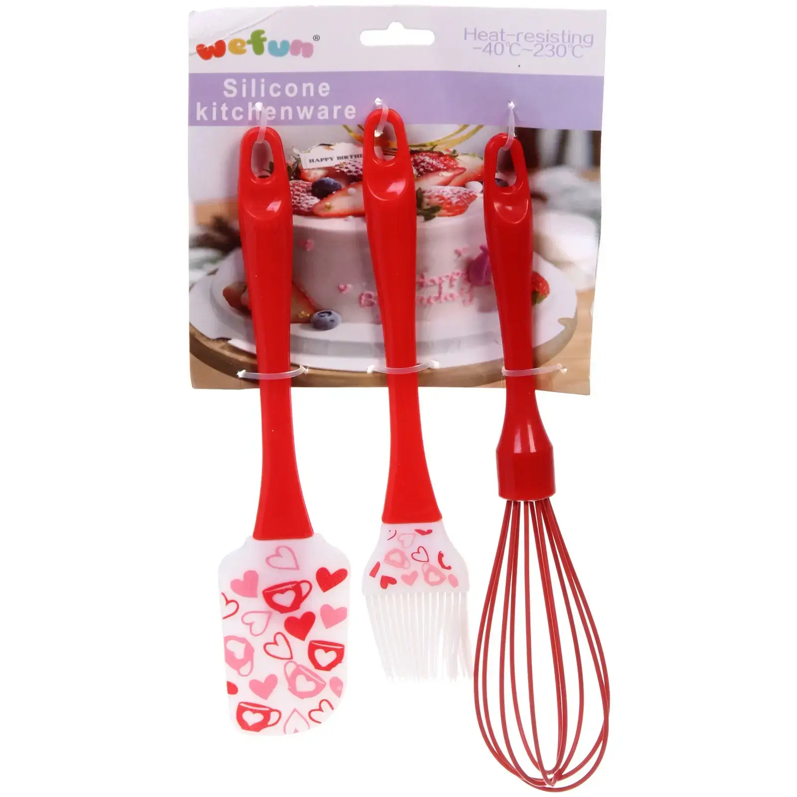 Этот универсальный кулинарный набор станет вашим незаменимым помощником на кухне, обеспечивая комфорт и удобство в процессе приготовления блюд. С его помощью вы сможете легко смазывать сковороды, готовить кондитерские изделия и перемешивать различные блюда. Набор включает в себя три предмета: лопатку, кисточку и венчик, каждый из которых выполнен из высококачественного силикона и имеет стильный красный дизайн.