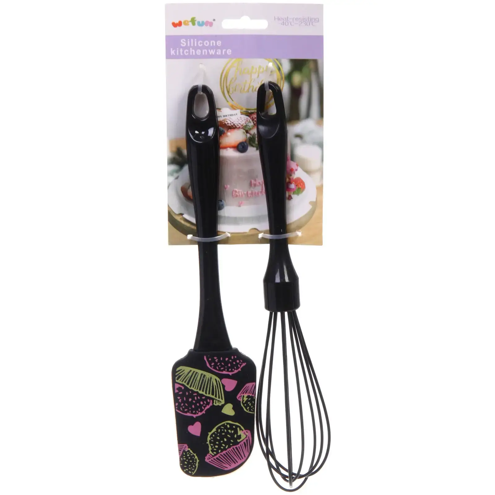 Лопатка и венчик имеют черные ручки, что обеспечивает надежный захват. Силиконовая часть лопатки украшена ярким узором, что делает набор не только функциональным, но и стильным. Упаковка оформлена в пастельных тонах с изображением праздничного торта, что делает его отличным подарком для любителей кулинарии.