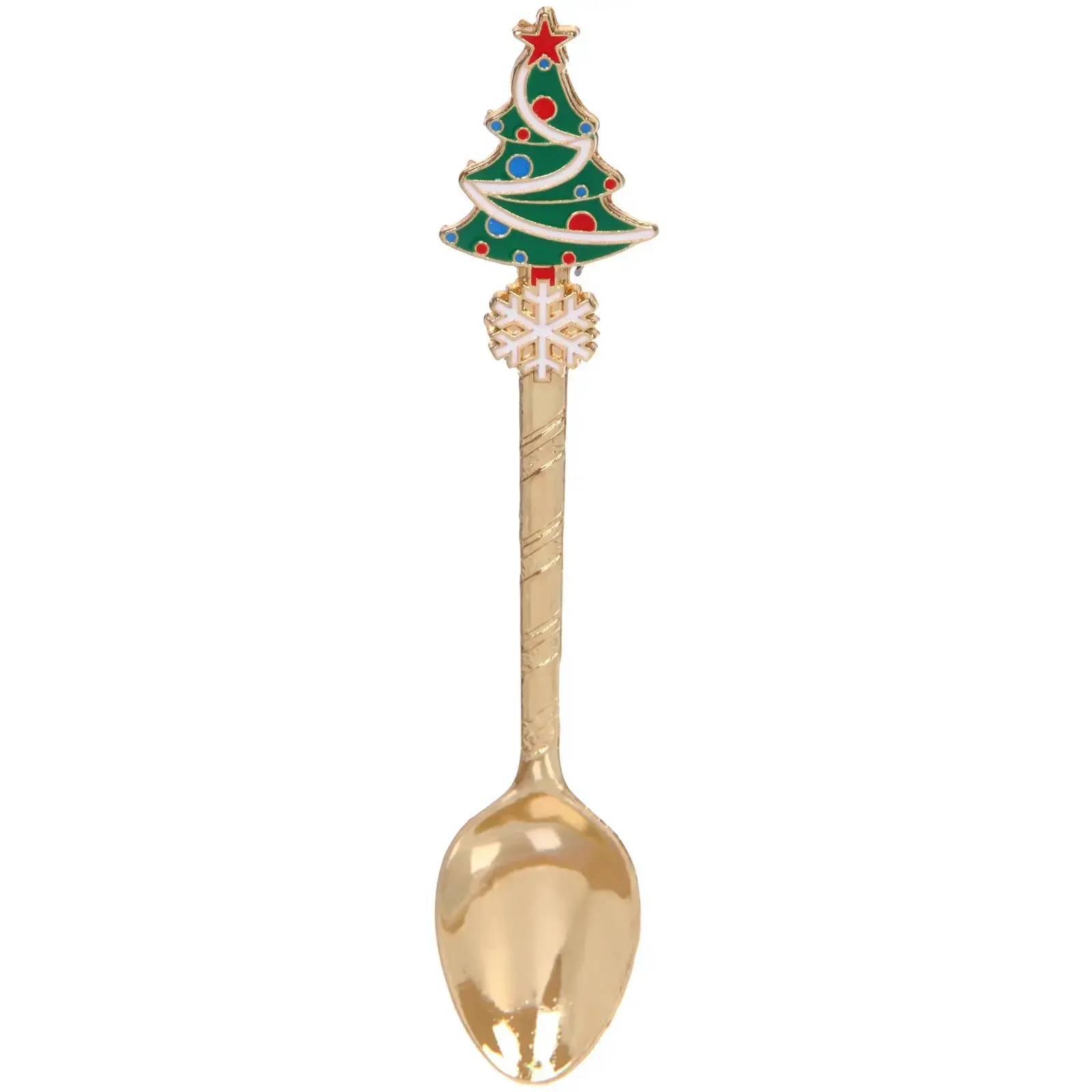 Каждая ложка украшена объёмным изображением новогодней ели с цветными шарами и звездой. Спиральный узор на ручке и снежинки у основания добавляют композиции динамики. Контрастное сочетание золота с цветными акцентами делает сервировку запоминающейся.