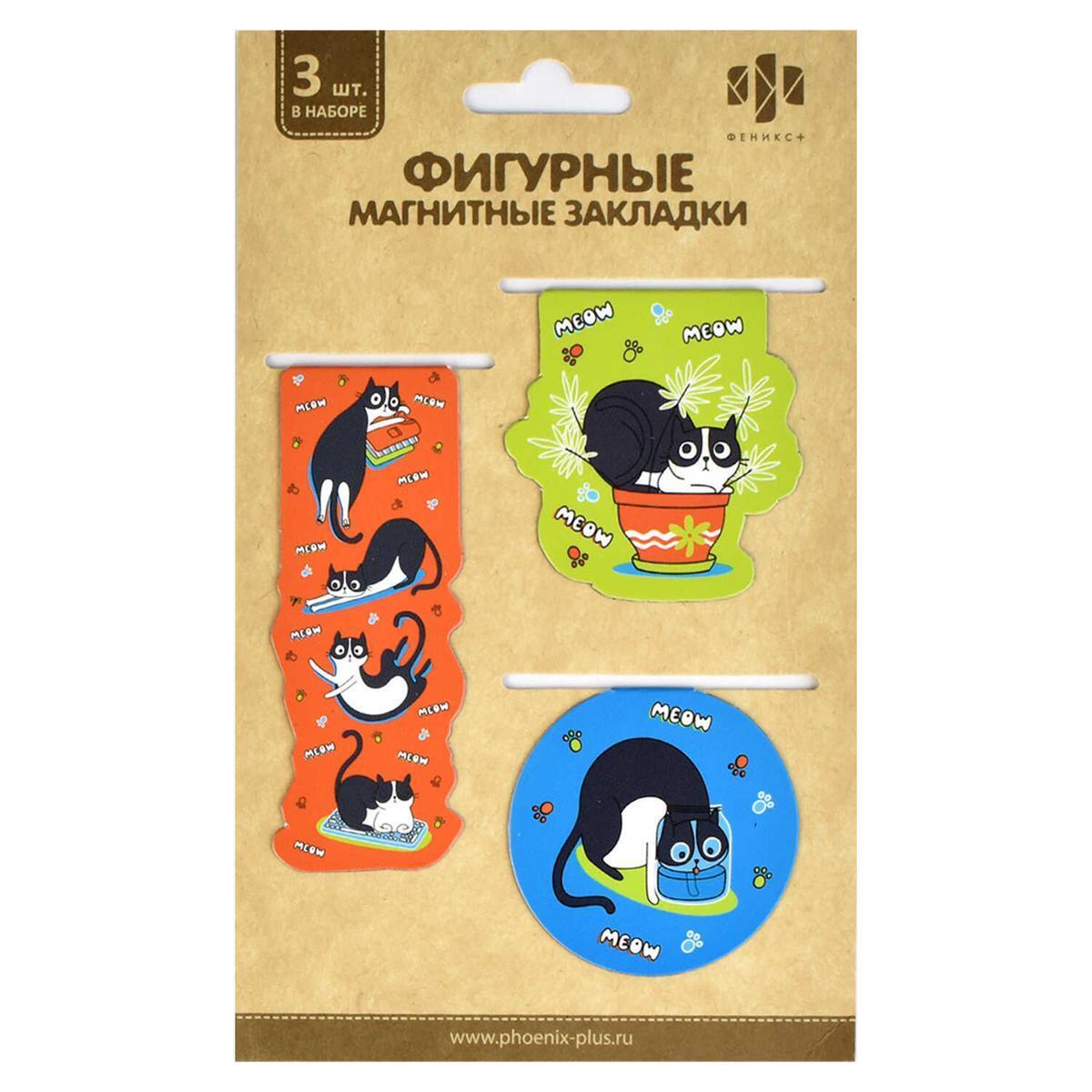 Набор магнитных закладок "Любопытный кот", 3 шт., мелованная бумага, магнитный винил 0.4 мм, оранжевый, зеленый, синий