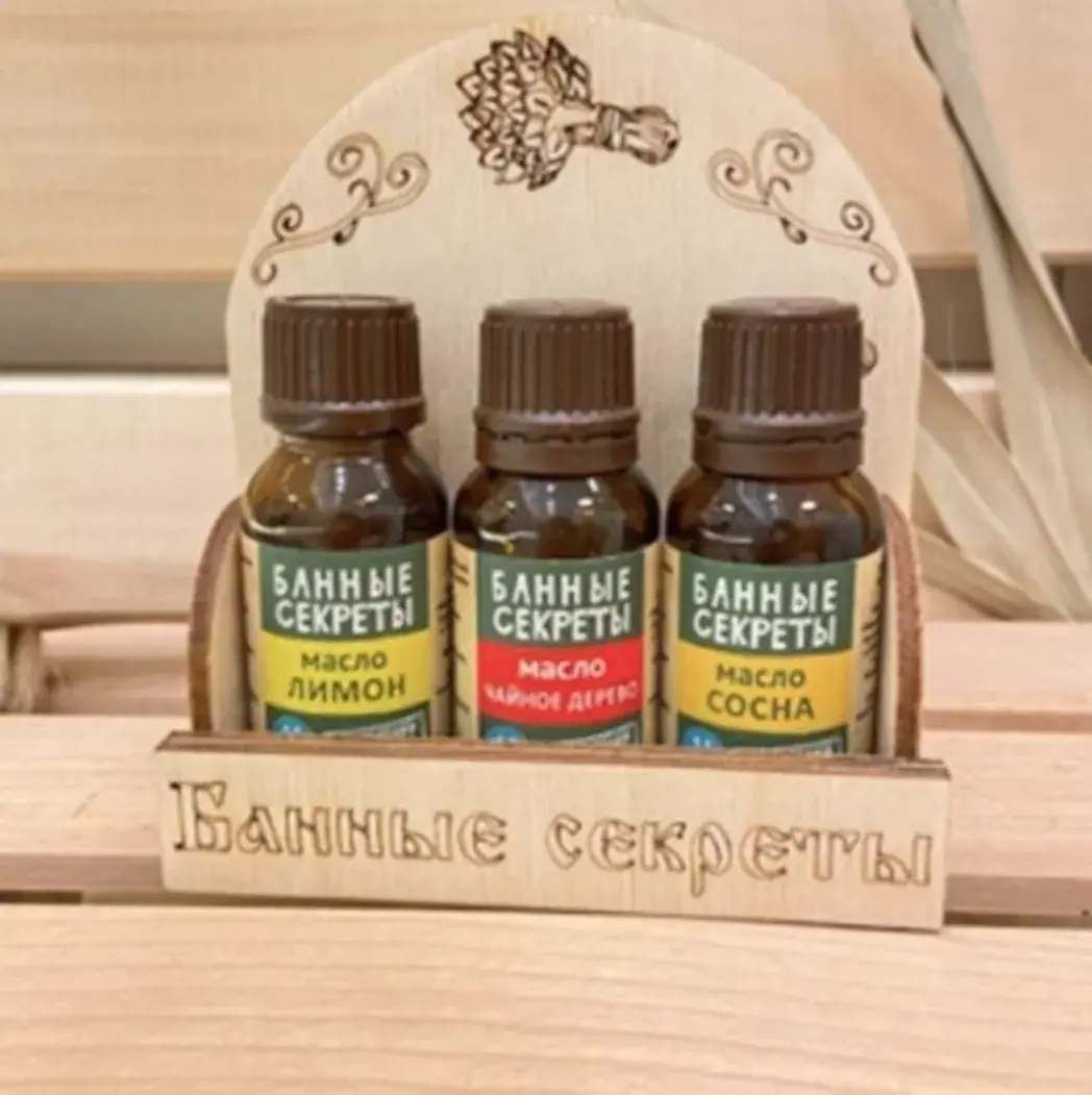 Масла разлиты в удобные флаконы по 15 мл, которые надежно установлены на стильной деревянной подставке. Компактный размер и продуманный дизайн делают набор идеальным подарком. Все масла произведены из натурального сырья в России компанией 'Банные секреты'.