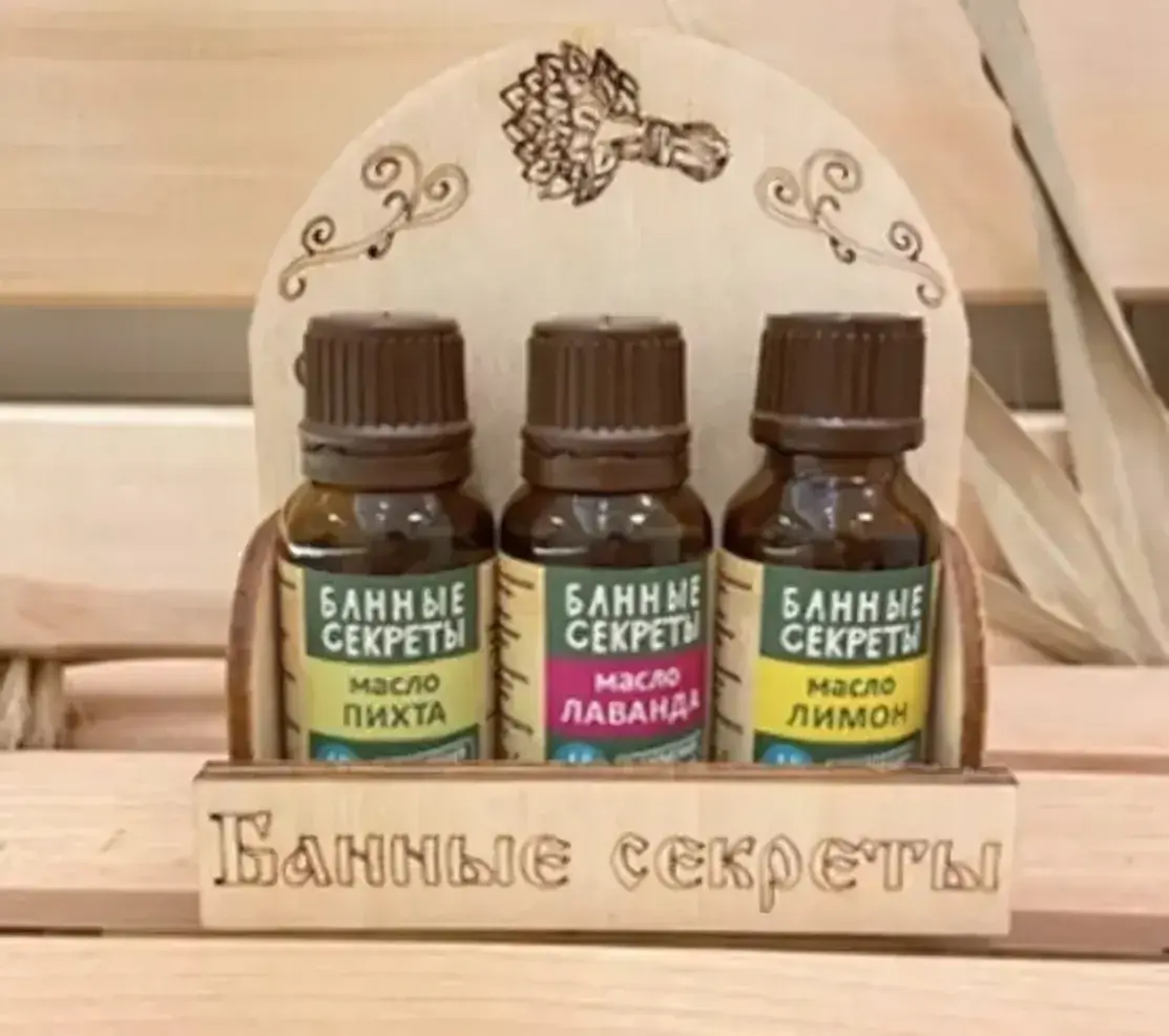 Набор включает три флакона с маслами: пихта, лаванда и лимон, каждый объемом 15 мл. Подставка выполнена из светлого дерева и украшена надписью «БАННЫЕ СЕКРЕТЫ», что добавляет эстетики и стиля. Этот набор станет не только полезным, но и красивым элементом вашего интерьера.