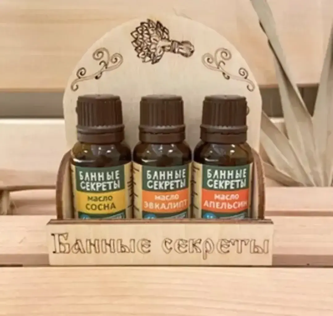Набор эфирных масел «Банные секреты» с деревянной подставкой, 3 флакона по 15 мл (сосна, эвкалипт, апельсин)