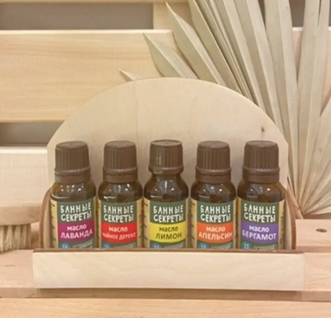 Набор эфирных масел «Банные Секреты» 5х15 мл с подставкой, лаванда, чайное дерево, лимон, апельсин, бергамот