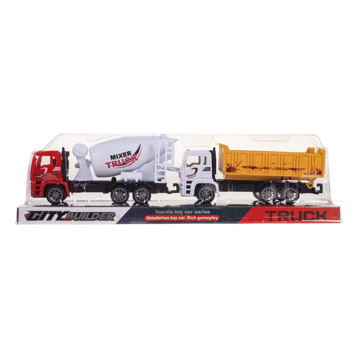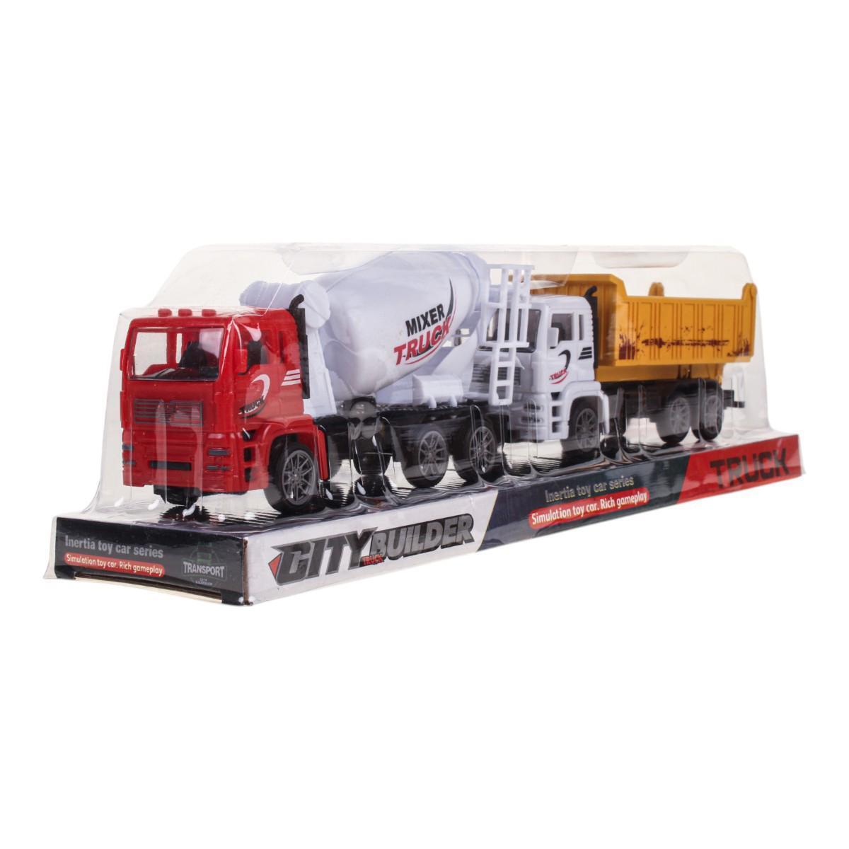 Каждая машинка выполнена из безопасного пластика. Размеры упаковки: 37,0 х 8,0 х 10,0 см. В комплекте: 1 бетономешалка и 1 самосвал.
