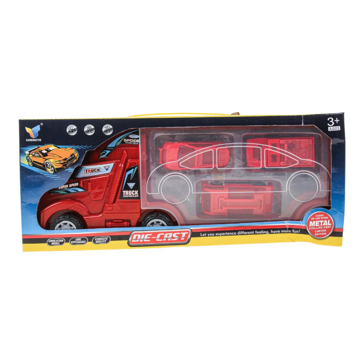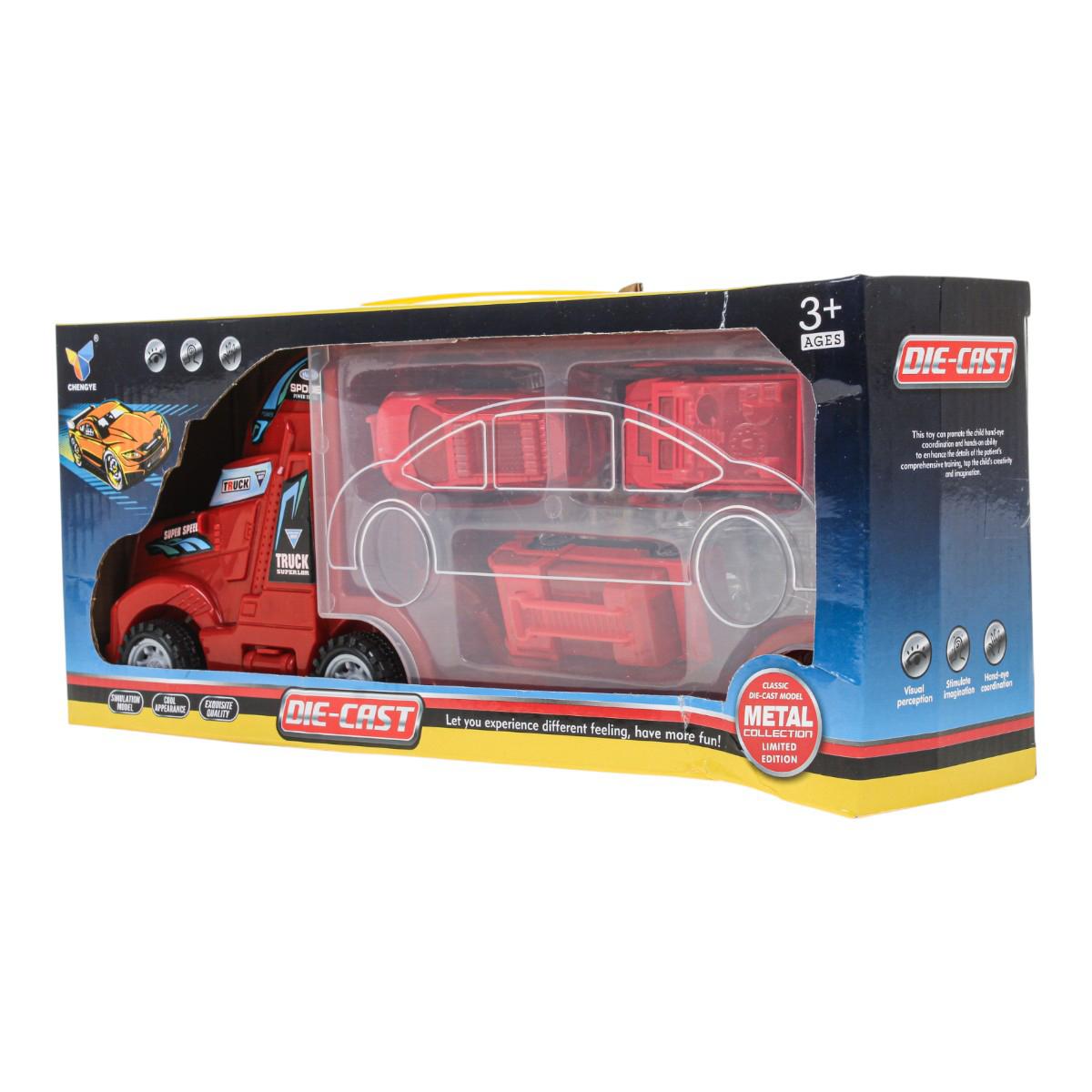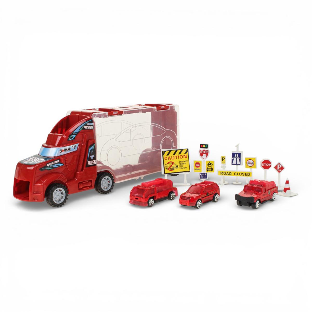 - Комплектация: грузовик, машинки, дорожные знаки и аксессуары — всего более 6 предметов.