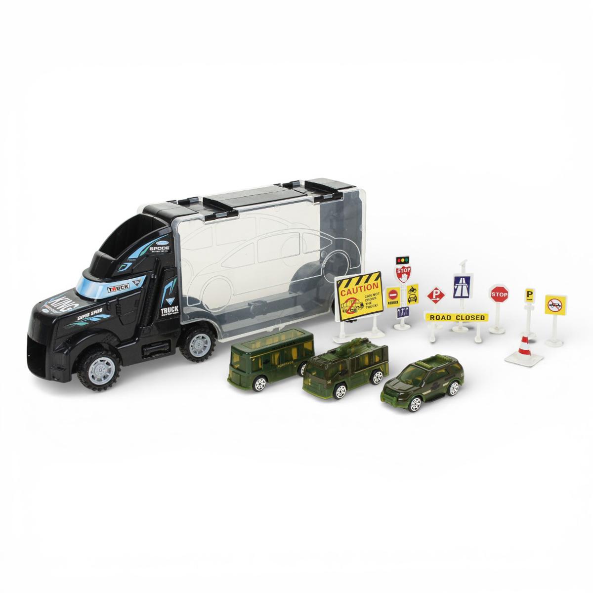 Игровой комплекс объединяет несколько любимых детских тем: большие машины, коллекционирование и моделирование дорожных ситуаций. Полуприцеп автовоза имеет прозрачные стенки, через которые отлично видны перевозимые машинки. Дорожные знаки и аксессуары делают игру более реалистичной и познавательной — можно изучать правила дорожного движения в игровой форме.