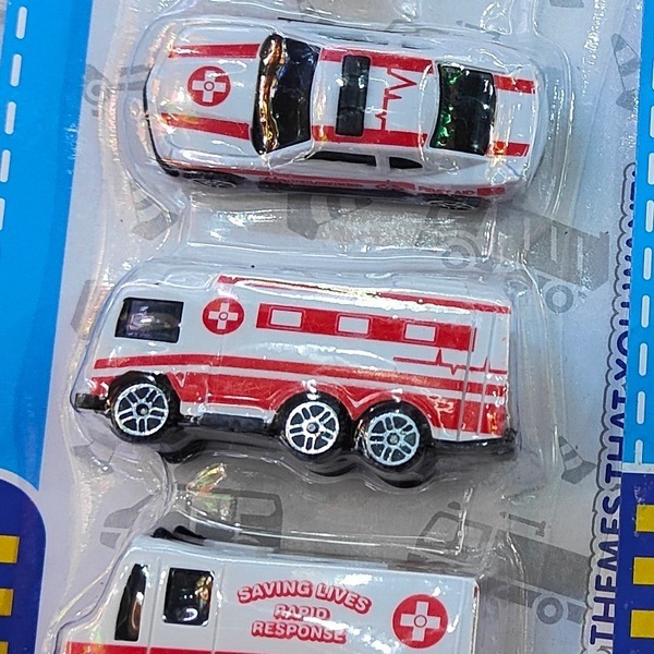 Размер каждой машины составляет 29 см в длину и 12 см в ширину. Все автомобили окрашены в белый цвет с красными и черными деталями, что делает их похожими на настоящие машины экстренной помощи. Упаковка из прозрачного пластика позволяет легко увидеть содержимое и делает набор идеальным подарком.