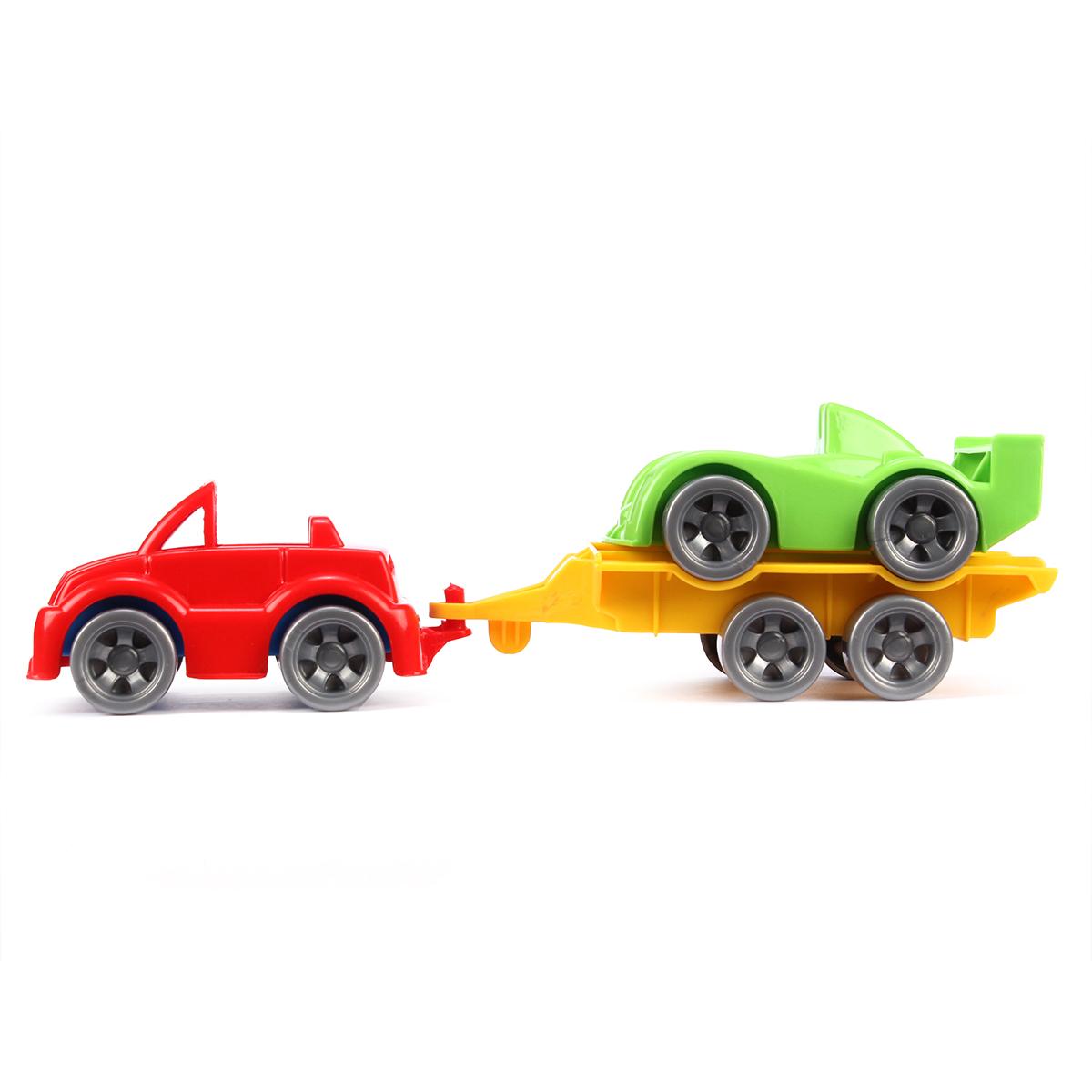 Погрузите ребенка в увлекательный мир автогонок с набором 'Kid cars Sport'. Комплект из трех элементов включает красный кабриолет, зеленую гоночную машину и желтый прицеп, которые станут идеальным подарком для маленького автолюбителя.