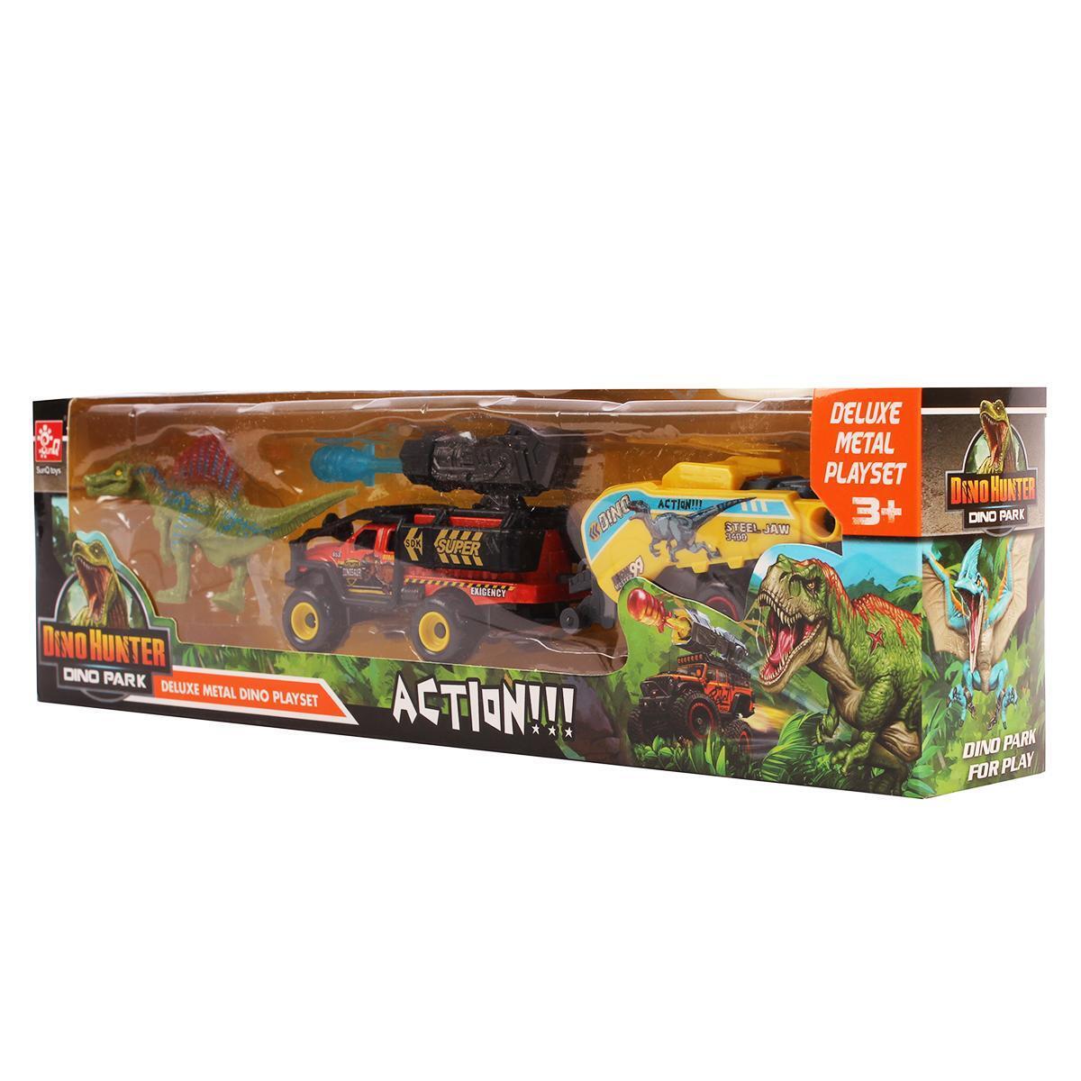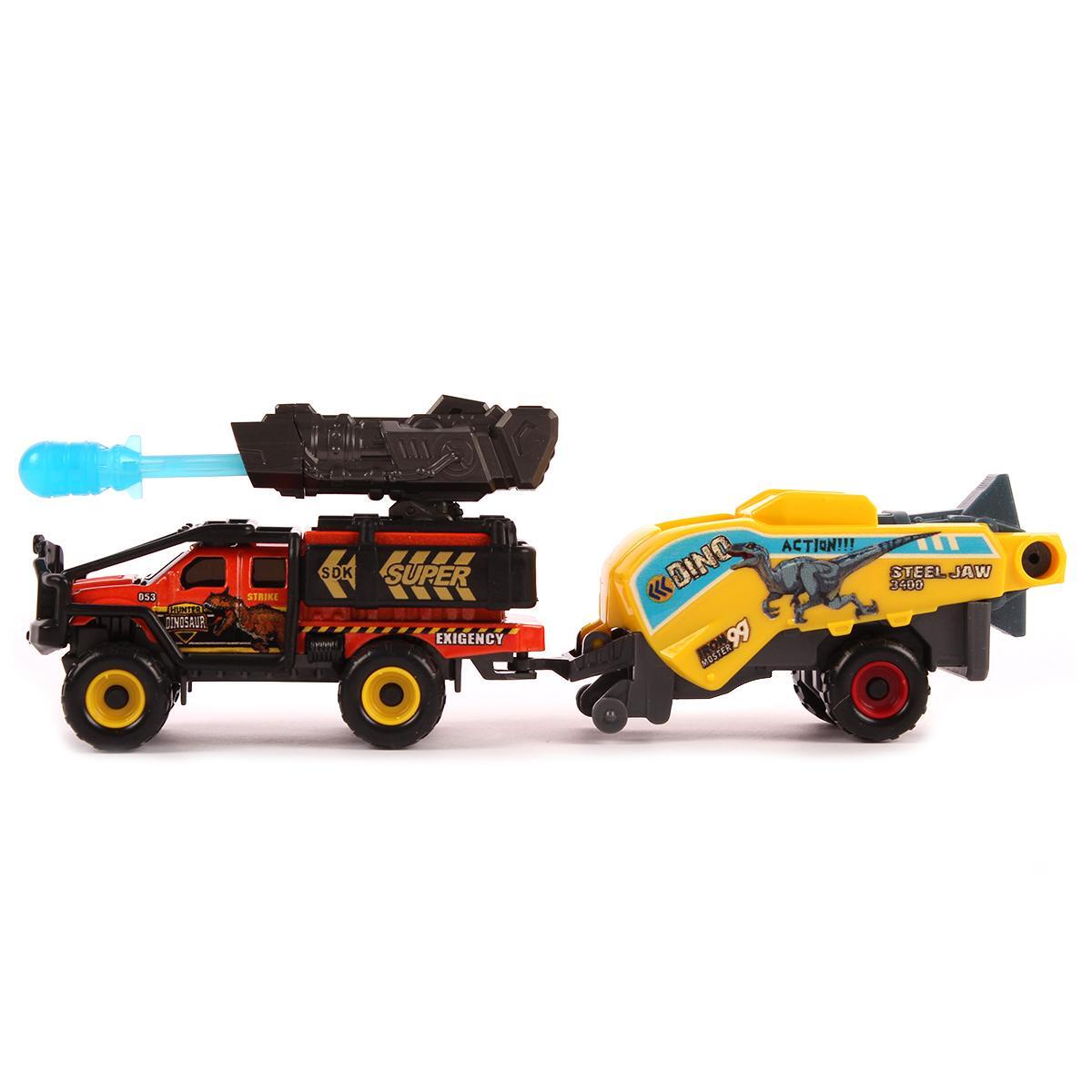 Комплект включает внедорожник с прицепом и динозавра, что делает его идеальным для сюжетных игр, приключенческих сцен и обучения. Благодаря ярким цветам и детализации, игрушки вызывают интерес у малышей и способствуют развитию фантазии.