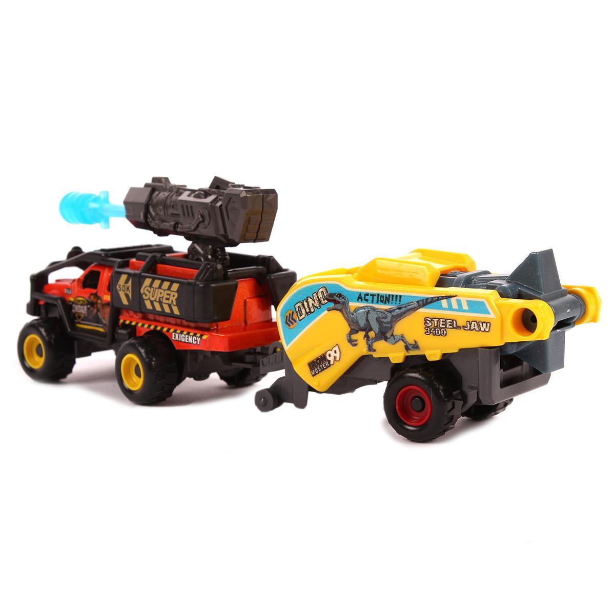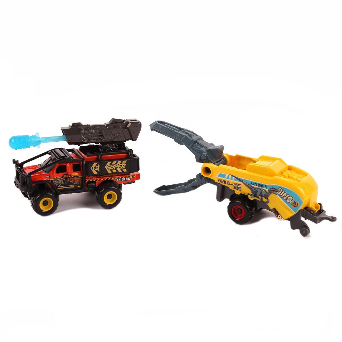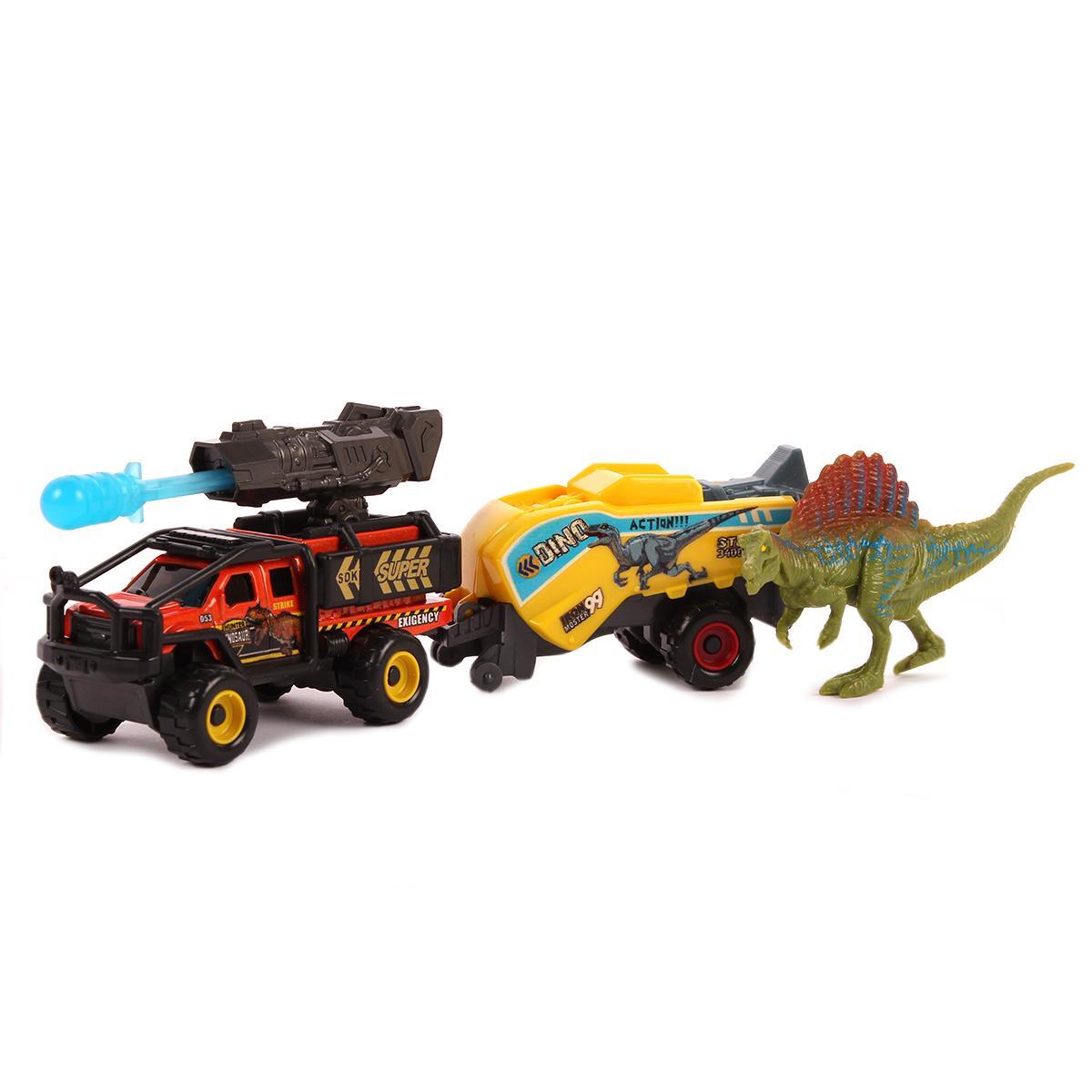 Этот набор игрушек предлагает детям увлекательные приключения с двумя моделями автомобилей, прицепом и фигуркой динозавра, выполненными из прочного пластика. Он подходит для активных игр дома и на улице, стимулируя воображение и моторное развитие.