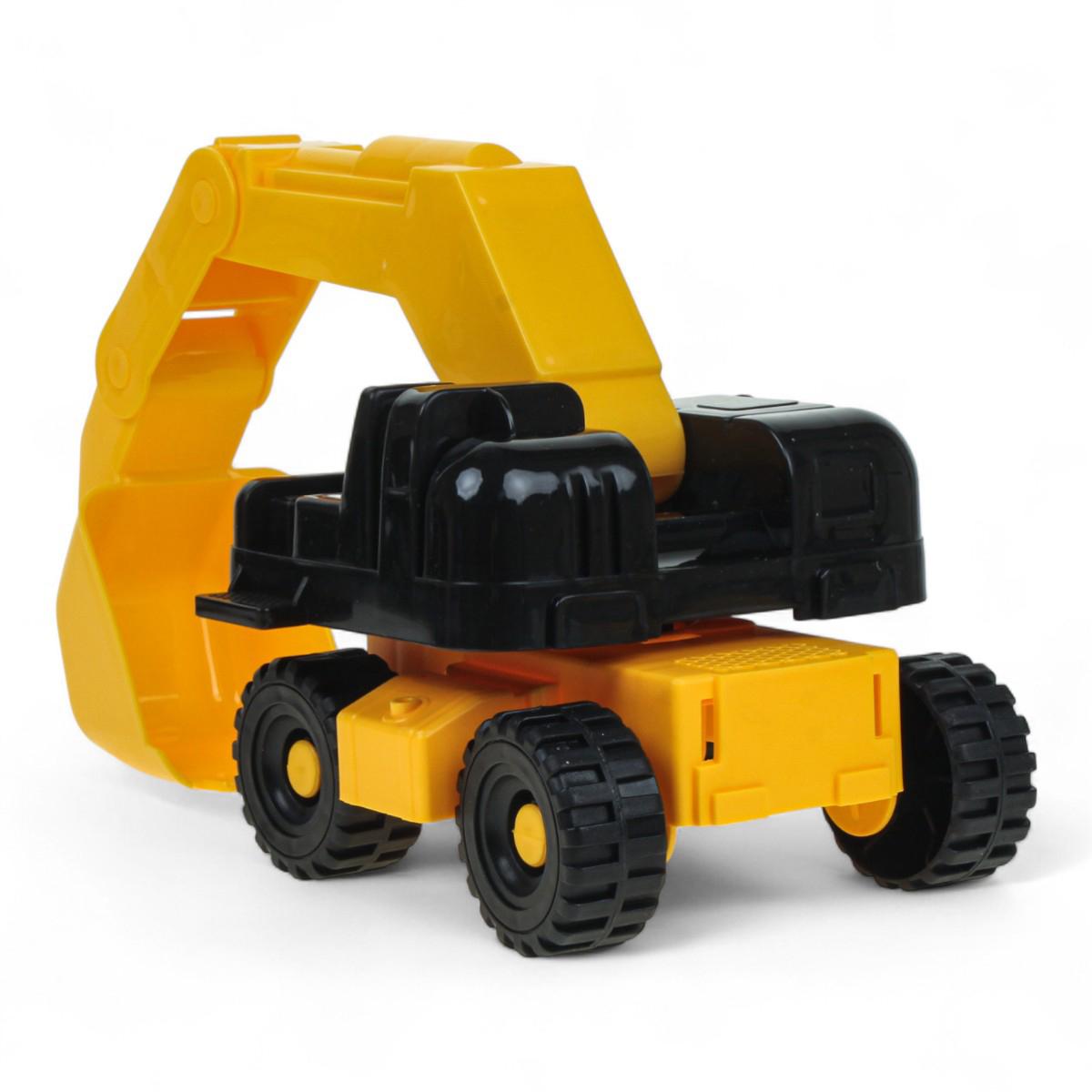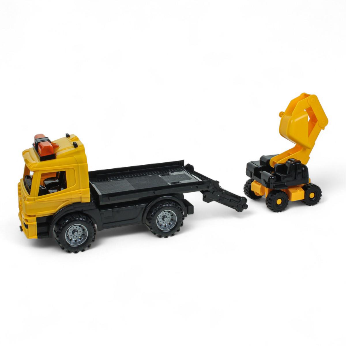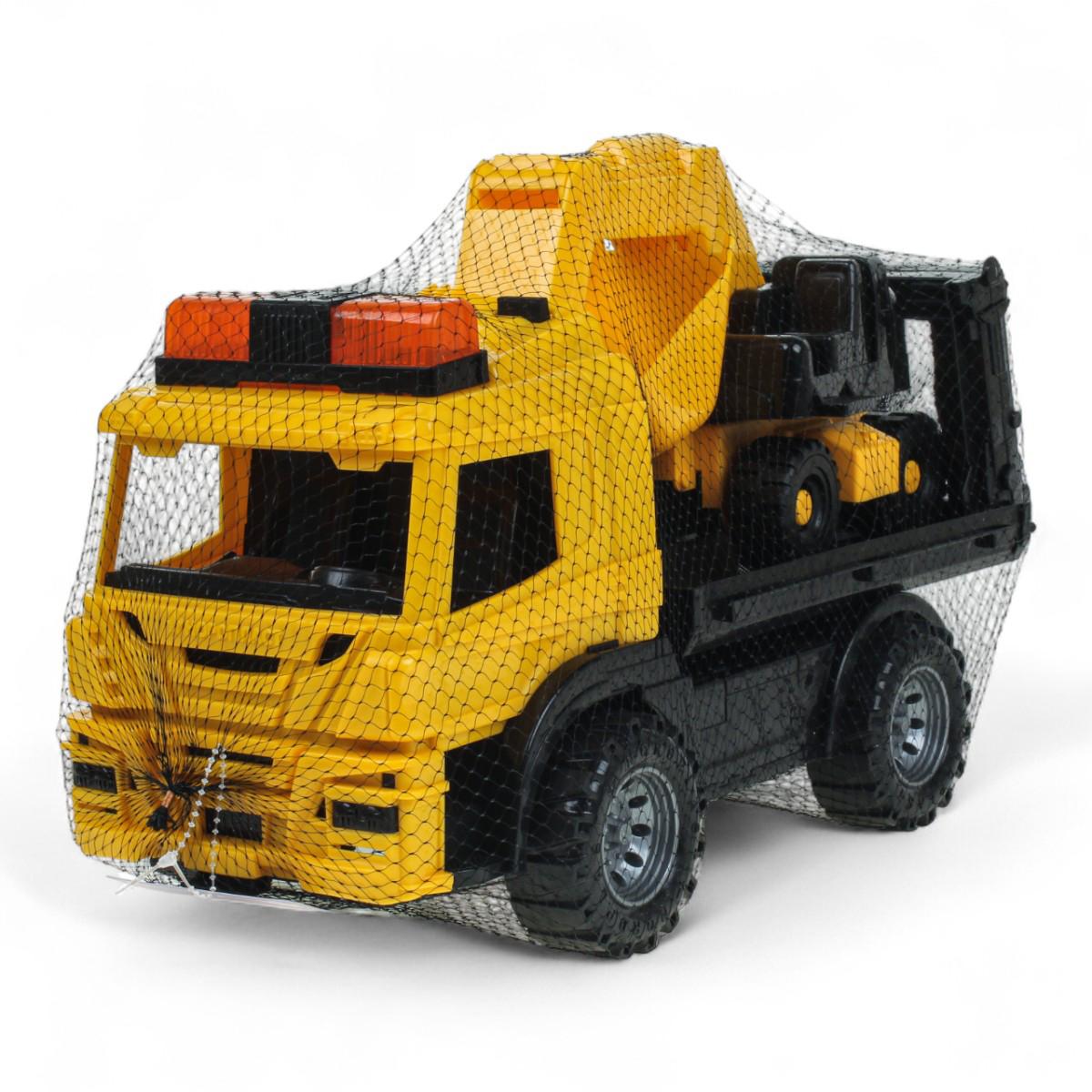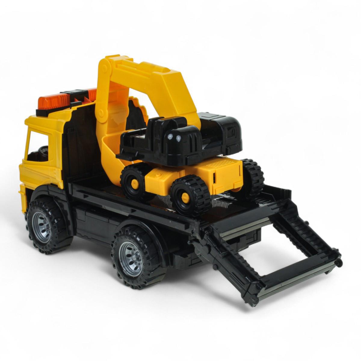 В комплект входят два полноценных транспортных средства: тягач и погрузчик. Колёса вращаются, а ковш погрузчика перемещается вверх и вниз, что позволяет моделировать рабочие сцены. Игрушки подходят для обыгрывания строительных сценариев на любой ровной поверхности и легко чистятся после игр.