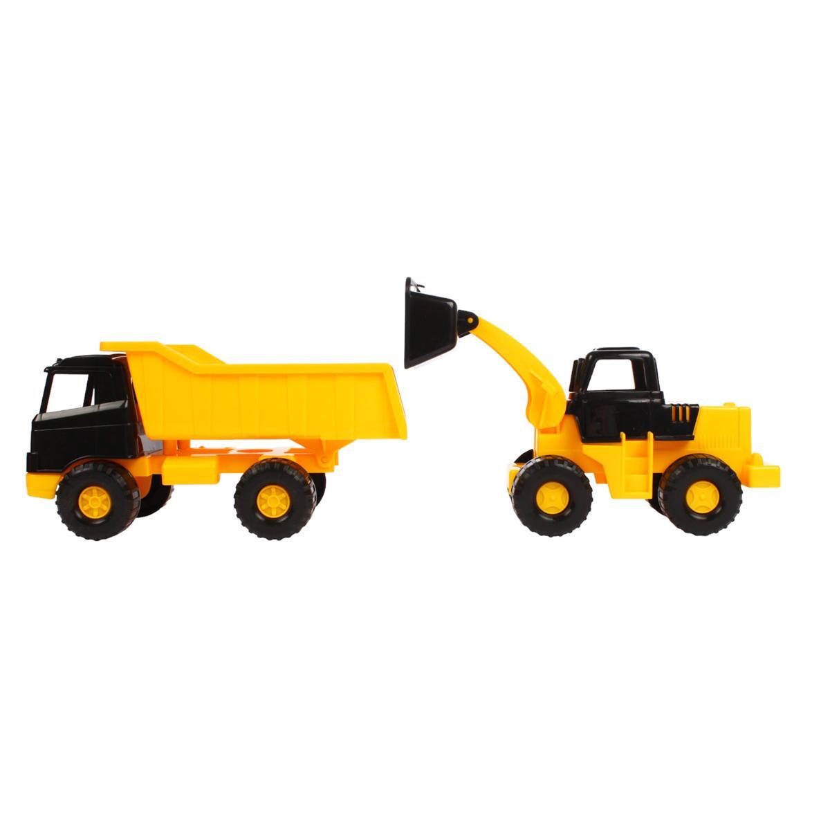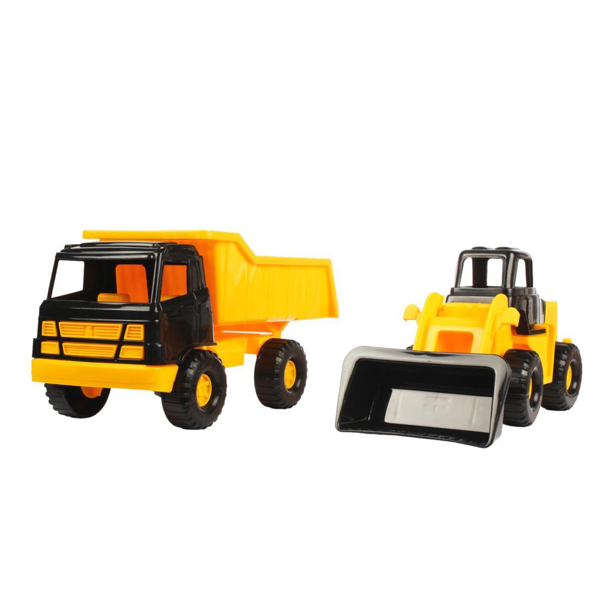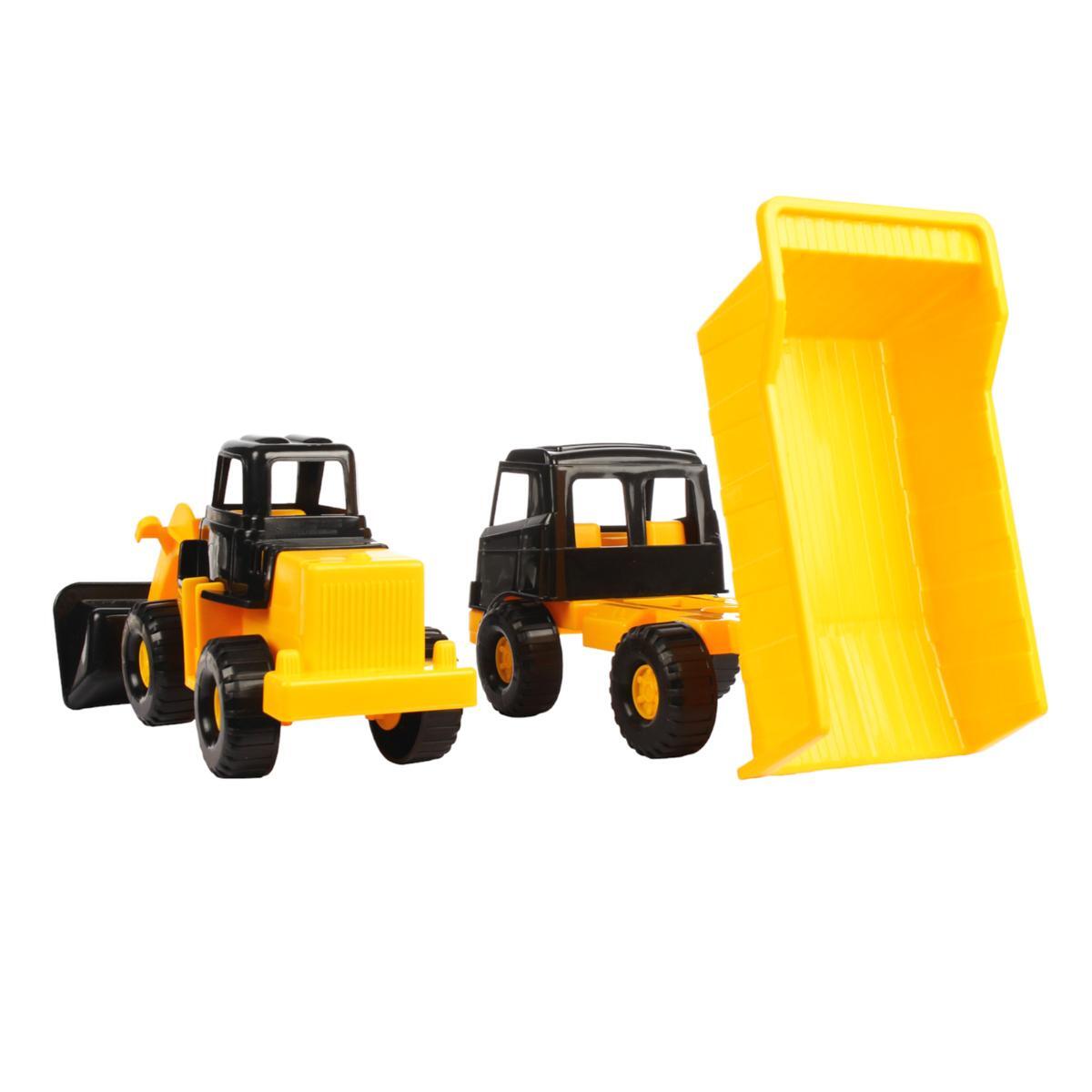 Игрушки выполнены из безопасного прочного пластика, с четкой деталировкой и яркими цветами, что делает их особенно привлекательными для детей. Каждая модель имеет устойчивые рельефные колеса, способствующие активной игре и высокой проходимости в разных условиях. Кузов грузовика и тракторные части поднимаются, колеса крутятся, а кабины позволяют разместить небольшие фигурки водителей, что развивает у детей интерес к инженерии и технике.