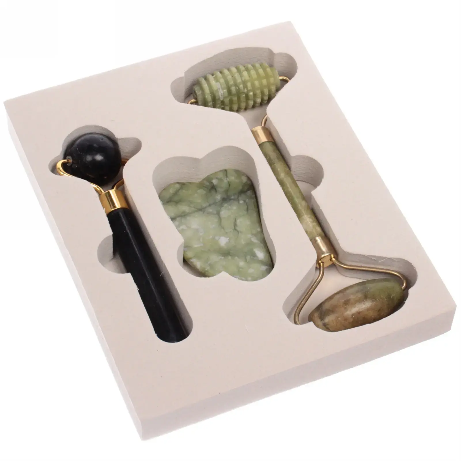Каждый инструмент выполнен из натурального камня и металла, что обеспечивает долговечность и надежность. Цвет массажеров — зеленый, что добавляет эстетическую привлекательность. Размеры инструментов не указаны, но они удобно лежат в руке и легко маневрируют по лицу. Упаковка набора выполнена из качественного картона, что делает его отличным подарком для близких.