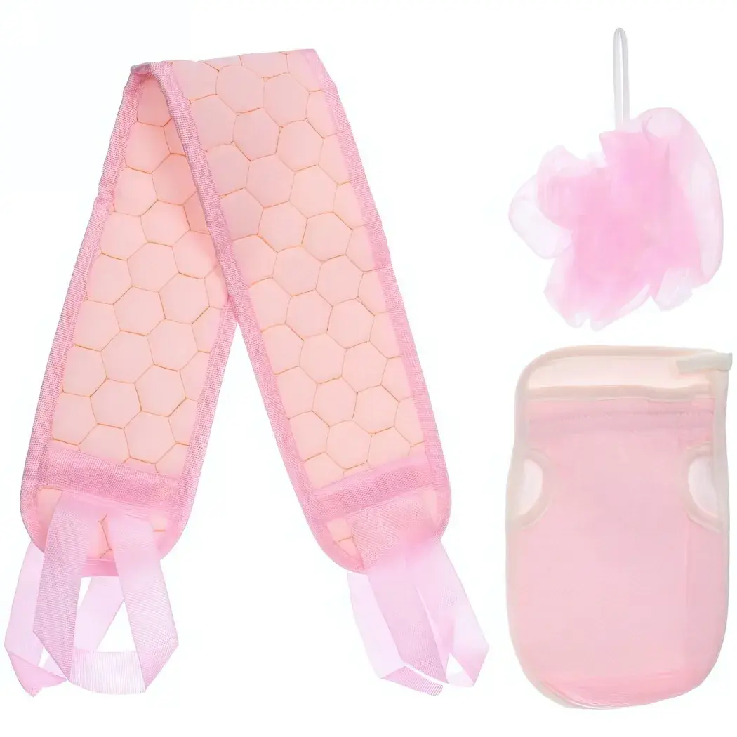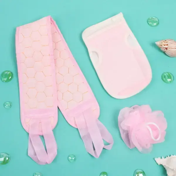 Набор включает три мочалки различных форм и размеров: две длинные с рельефной поверхностью и одна в форме цветка. Они идеально подходят для использования в душе или ванной, обеспечивая мягкое и бережное очищение кожи. Мочалки легко держать в руках благодаря удобным петелькам, что делает их использование простым и комфортным.