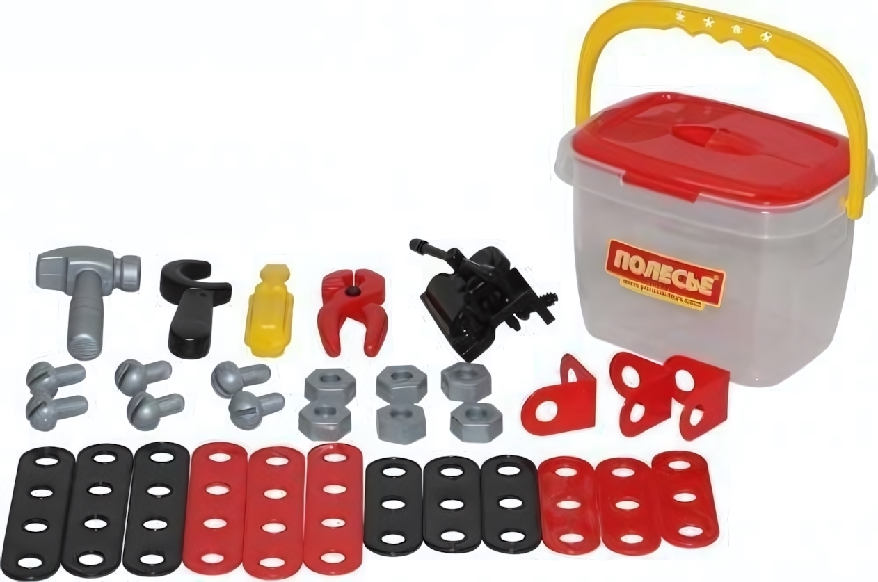 В набор входят: болты, гайки, уголки, пластины для соединения элементов, гаечный ключ, молоток, отвертка, пассатижи и тиски. Все элементы выполнены из легкого и прочного пластика, что делает их безопасными для детей. Контейнер для хранения выполнен из прозрачного пластика с красной крышкой и желтой ручкой, что добавляет яркости и удобства в использовании.
