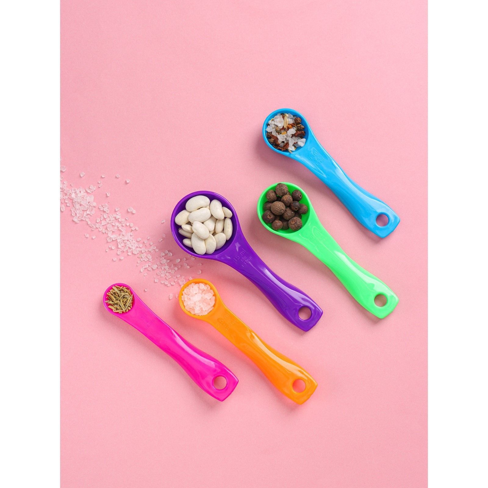 Почему стоит выбрать именно этот набор? Во-первых, он выполнен из качественного пищевого пластика, что гарантирует безопасность использования. Во-вторых, яркие цвета (фиолетовый, зеленый, оранжевый, голубой и розовый) не только радуют глаз, но и помогают быстро находить нужную ложку в кухонных принадлежностях. В-третьих, наличие отверстия для подвешивания позволяет удобно хранить ложки, не занимая много места.
