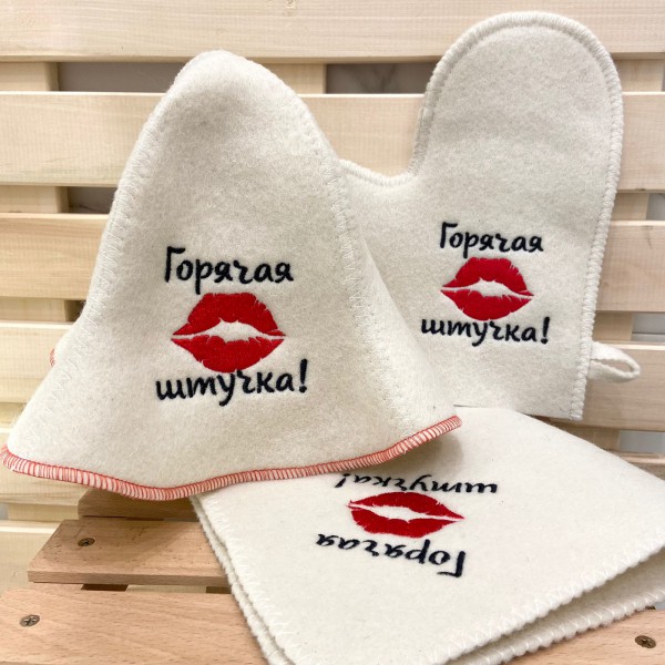 Все предметы выполнены из плотного светлого материала с аккуратной обработкой краев. Шапка имеет удобную форму, варежка дополнена петлей для подвешивания, а коврик легко размещается на полке или скамье. Декоративная вышивка с контрастной надписью и изображением губ придает набору выразительный характер и делает его заметным среди других банных аксессуаров.