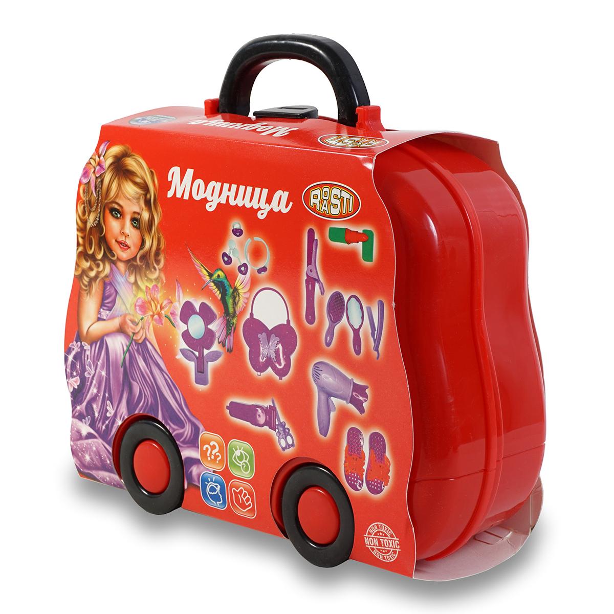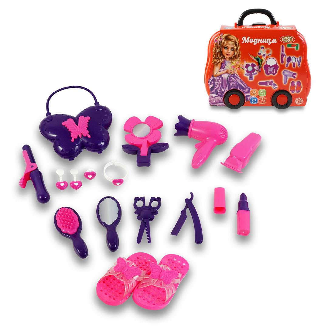 В комплект входит чемодан размером 27x10x22 см, выполненный из прочного пластика, и 13 аксессуаров: фен, расчески, зеркальце, заколки, помада, ножницы и другие элементы, необходимые для сюжетных игр. Все предметы безопасны для ребенка и легко убираются, что обеспечивает удобство использования и долговечность.