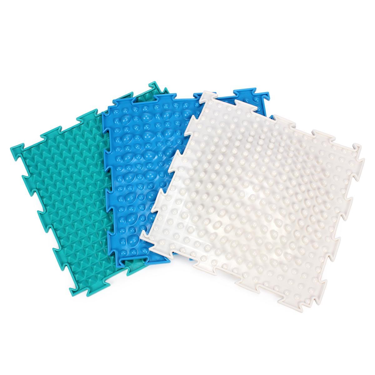 Каждый модуль коврика имеет квадратную форму и представлен в различных цветах: светло-голубом, тёмно-голубом, белом и двух оттенках зелёного. Текстурированные поверхности включают выступы и пирамидки, что делает игру разнообразной и увлекательной. Размеры модулей стандартные, что позволяет легко комбинировать их с другими игрушками и аксессуарами.