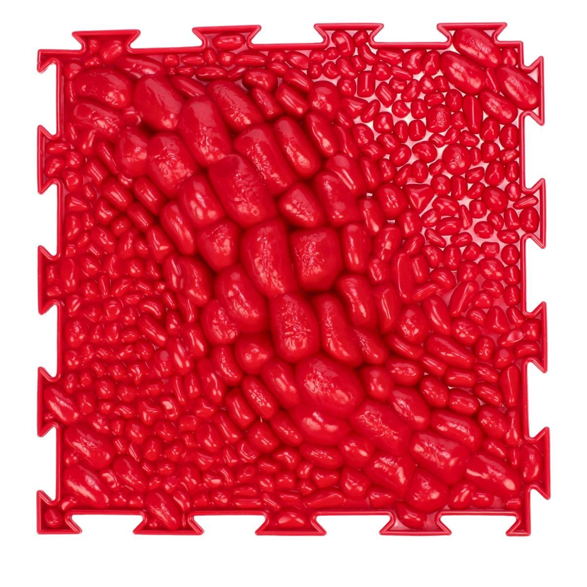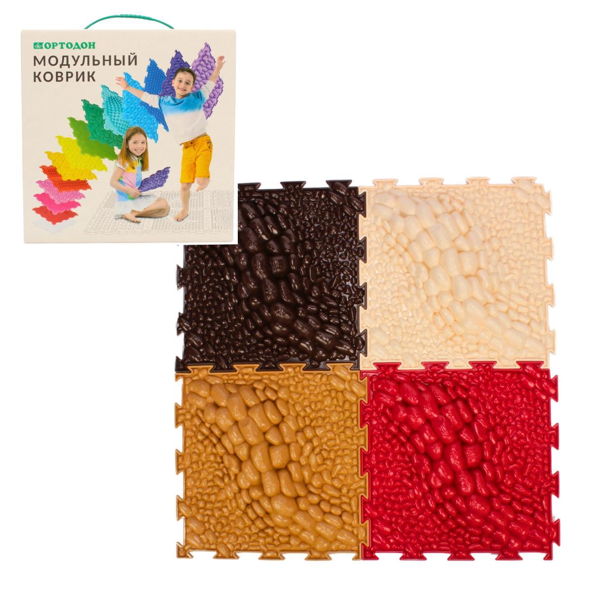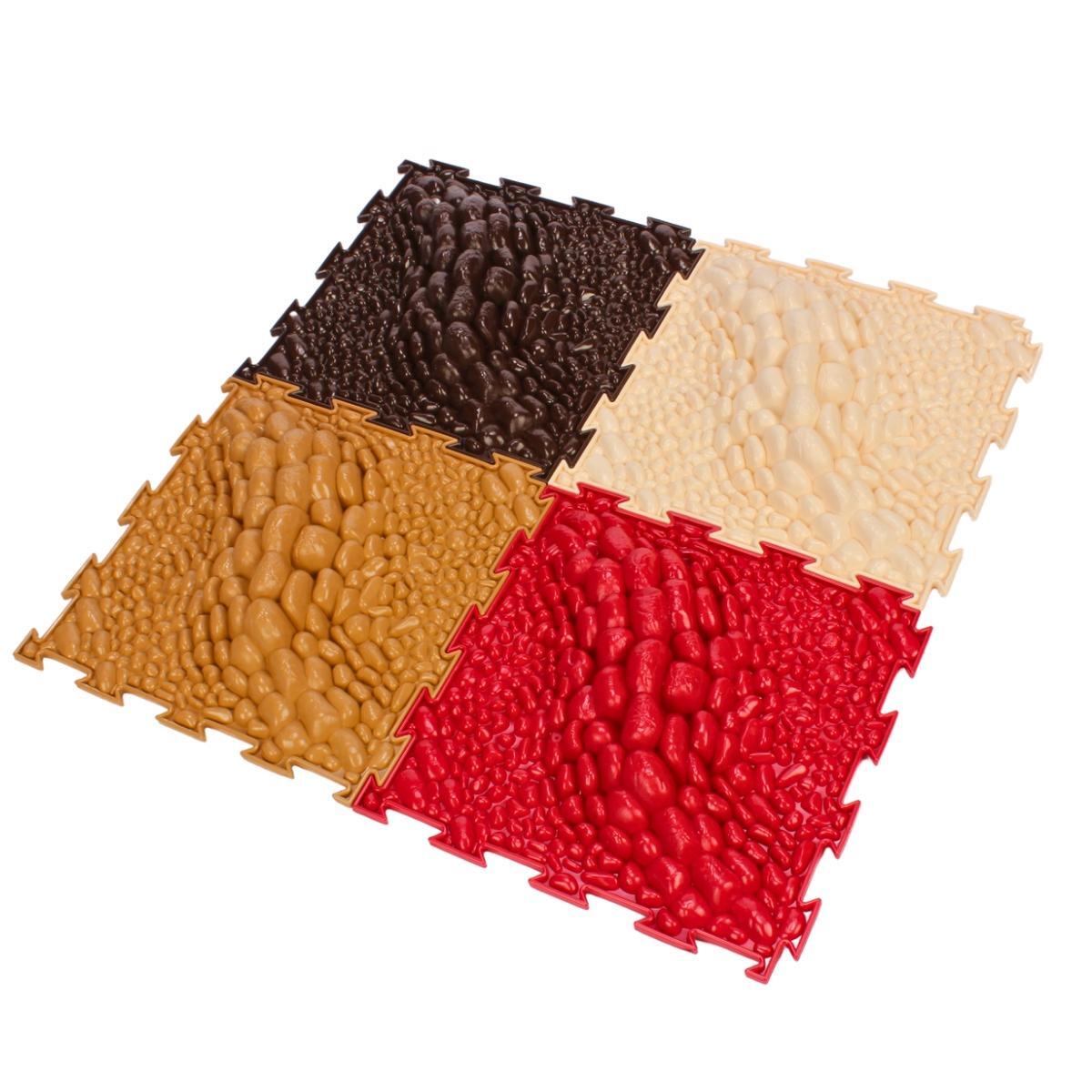 В комплект входит 4 квадратных элемента разного цвета: красного, чёрного, бежевого и светло-коричневого. Рельефная поверхность с шариками и гладкими участками создаёт приятное и полезное ощущение при ходьбе босиком или в носочках. Материал — износостойкий полимер, обеспечивающий долгий срок службы и простоту в уходе. Коврик незаменим для организации уютного, безопасного и развивающего пространства для ребёнка.