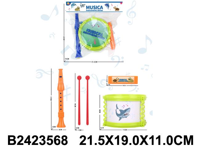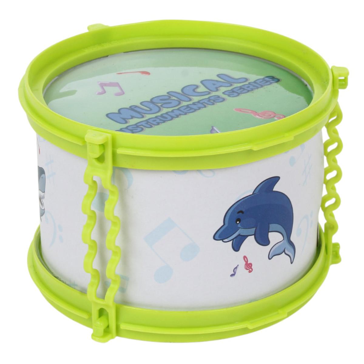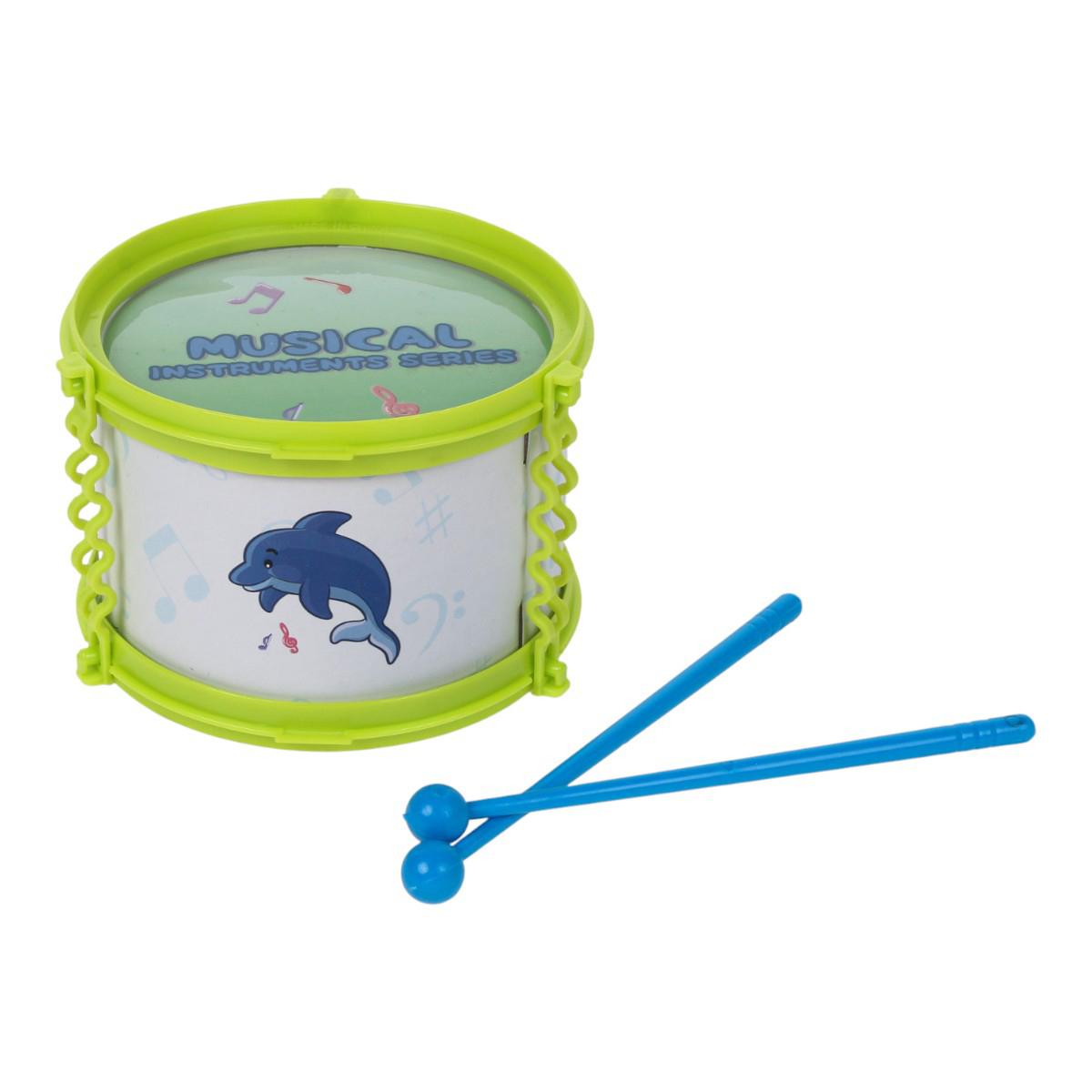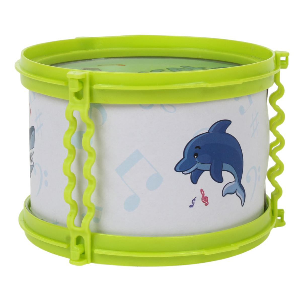 - Барабан с полупрозрачной мембраной, зелёными ободками и фигурными стойками. На боковой поверхности изображён весёлый дельфин и нотки.