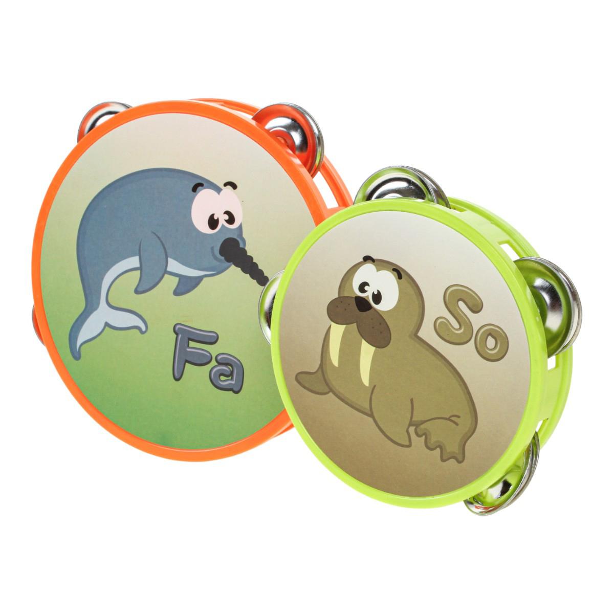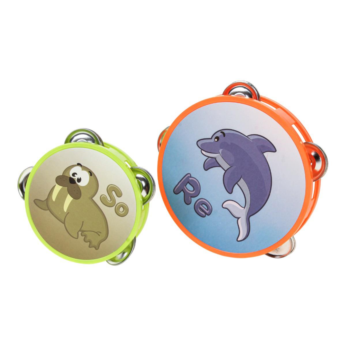 - Бубен (2 штуки) с изображениями забавных животных (дельфин и морж) и металлическими тарелочками по краю для звонкого звучания.