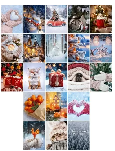 - Тематический набор из 21 уникального рисунка: варежки, снежные деревья, гирлянды, домашние сцены, милые животные и горячие напитки.