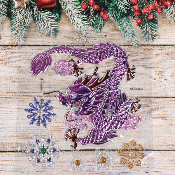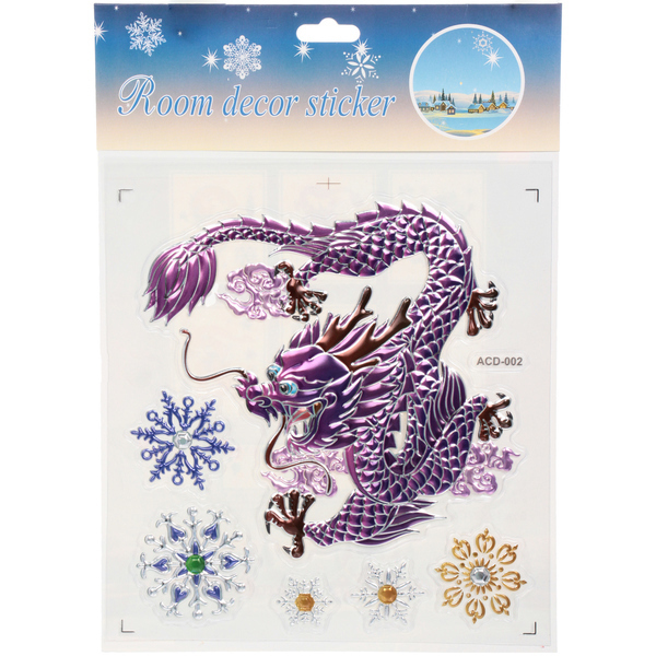 В наборе: наклейка с изображением дракона и несколько снежинок.