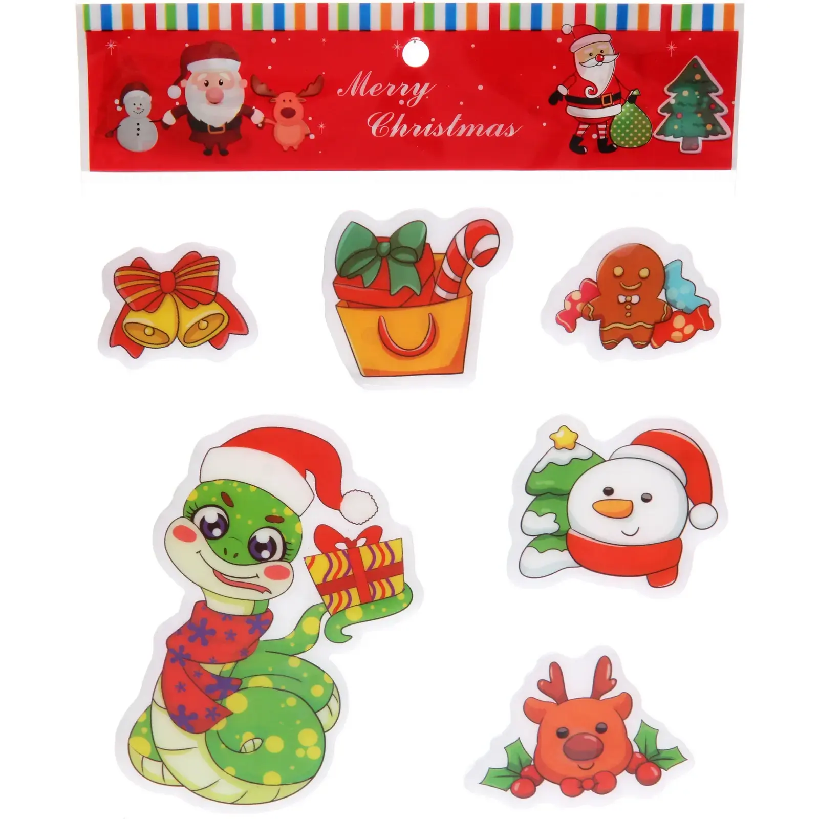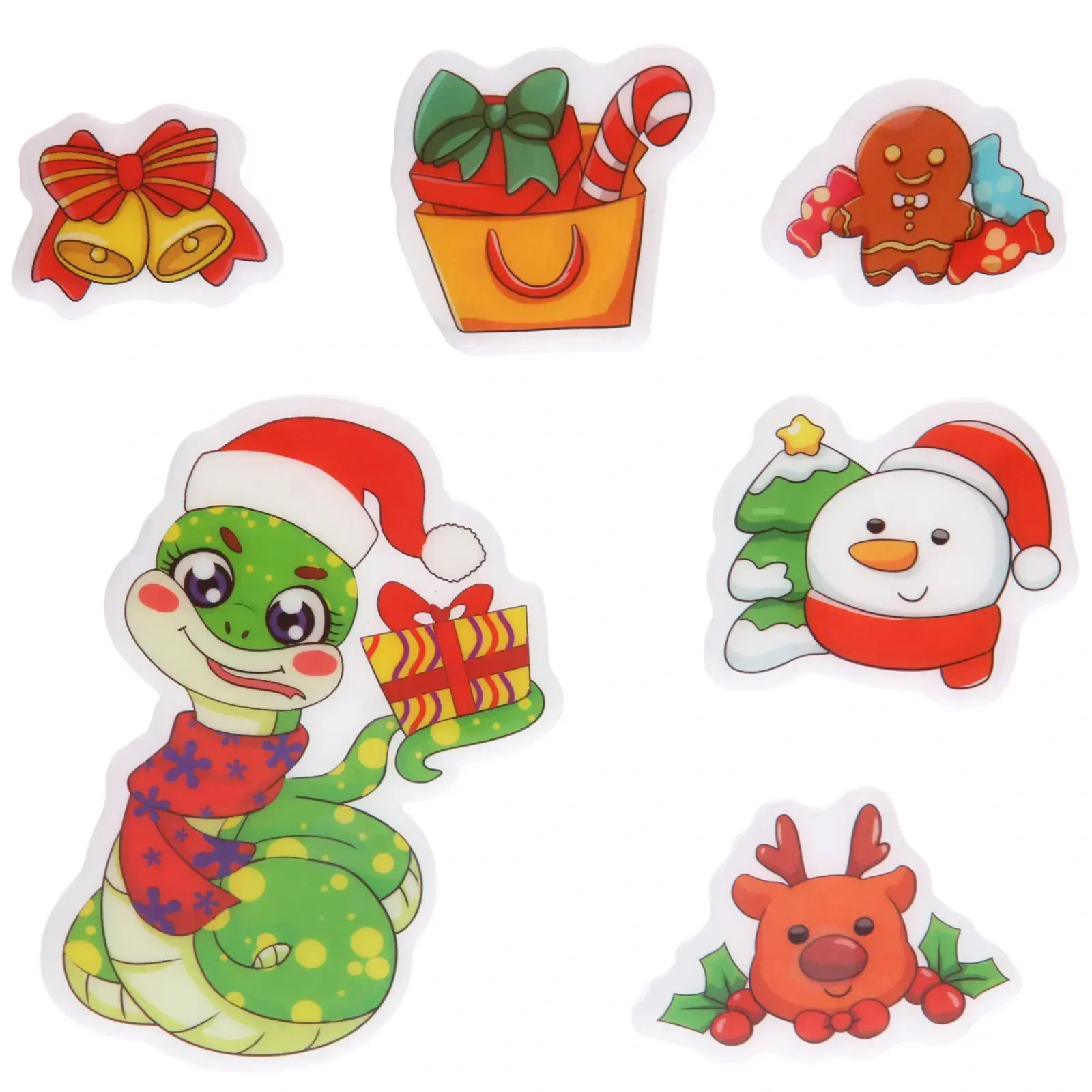 Размер наклеек составляет 20*20 см, что делает их компактными и удобными для использования. В наборе представлены различные персонажи, такие как зелёная змея в новогодней шапке, снеговик, олень и пряничный человек. Каждый элемент выполнен в яркой цветовой гамме, включая зелёный, красный, жёлтый и белый цвета, что делает их идеальными для создания праздничного декора.