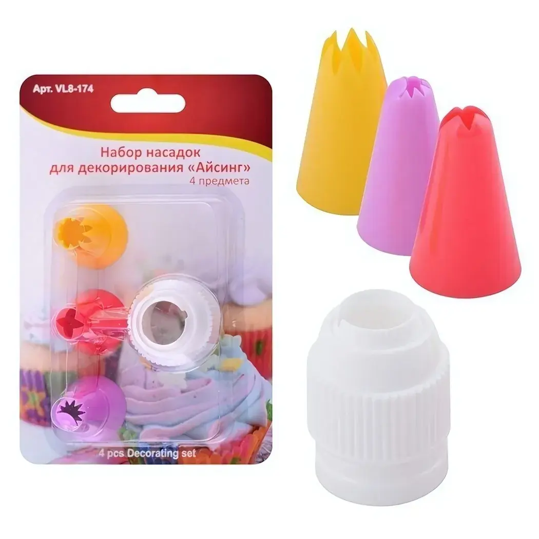 Набор состоит из четырех насадок, каждая из которых имеет уникальную форму и прорези для создания различных узоров. Используйте их с кремом или глазурью, чтобы добиться желаемого эффекта. Насадки легко крепятся к кондитерскому мешку, что делает процесс декорирования простым и удобным. Этот набор идеально подходит как для профессиональных кондитеров, так и для домашних кулинаров, желающих порадовать своих близких.