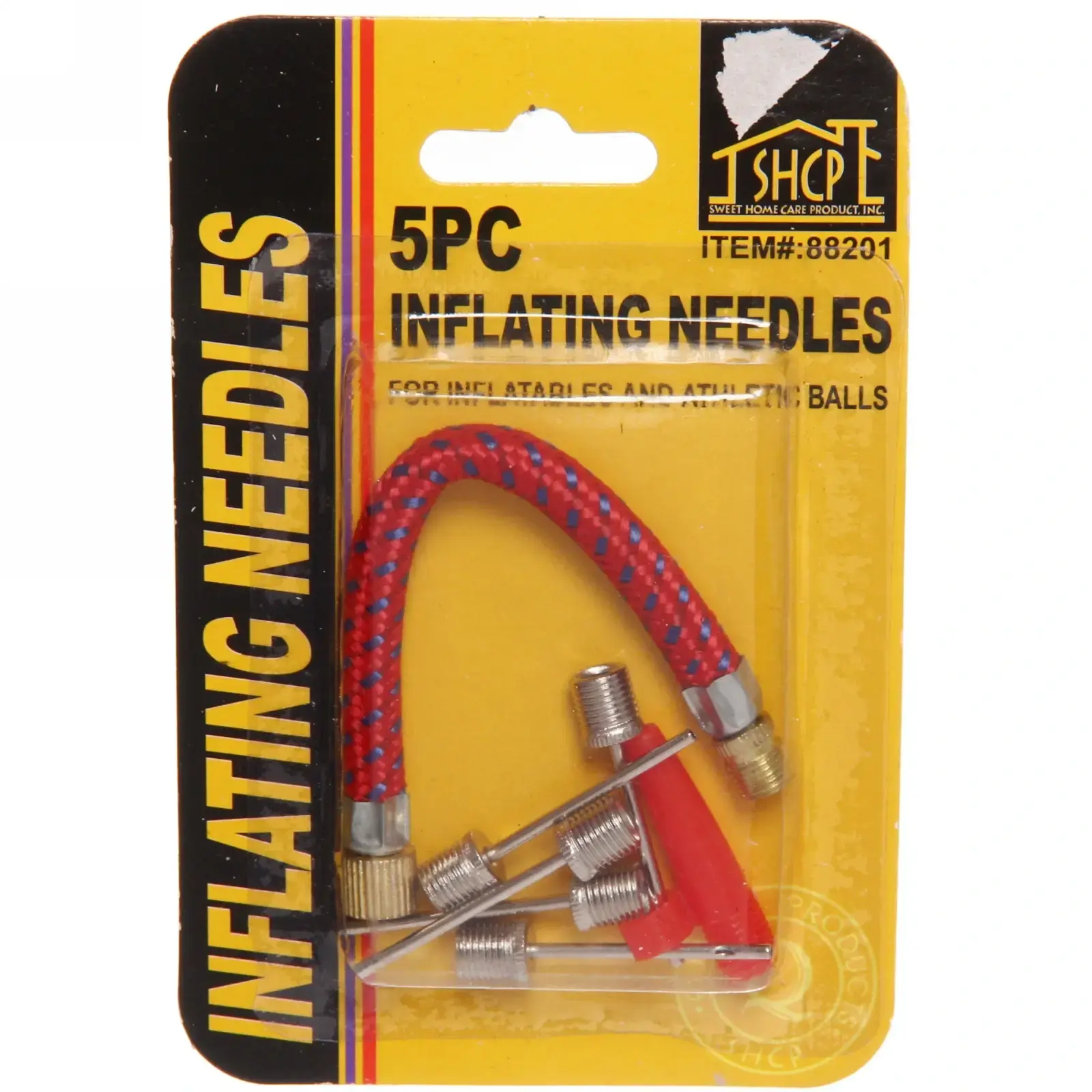 Каждая игла имеет цилиндрическую форму и выполнена из прочного металла, что обеспечивает надежность и долговечность. Шланг, входящий в комплект, имеет изогнутую форму и удобен в использовании. Набор упакован в яркую желтую упаковку, что делает его легко заметным и удобным для хранения.