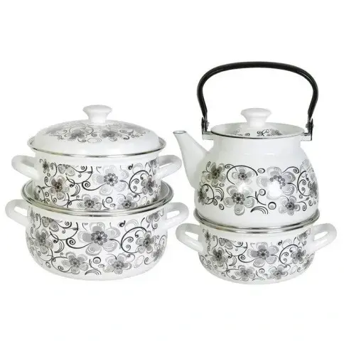 Эмалированная посуда с цветочным декором объединяет практичность и элегантность. В комплекте — всё необходимое для приготовления первых блюд, гарниров и горячих напитков. Надежная защита от коррозии и стильный дизайн сделают набор вашим верным помощником на долгие годы.