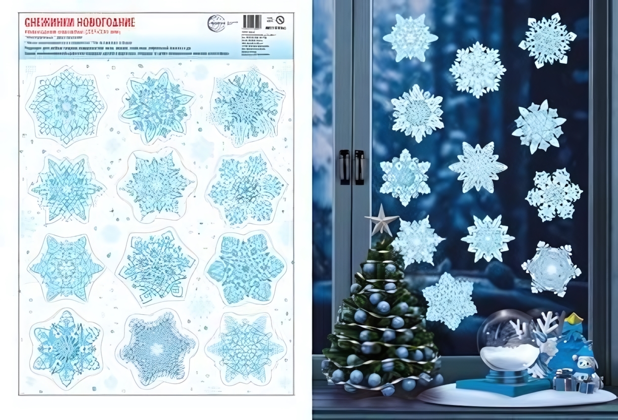 Формат листа — А4+. Размер снежинок варьируется, чтобы декор выглядел объемно и естественно. При заказе отгружается один набор, в который входят все наклейки, представленные на листе.