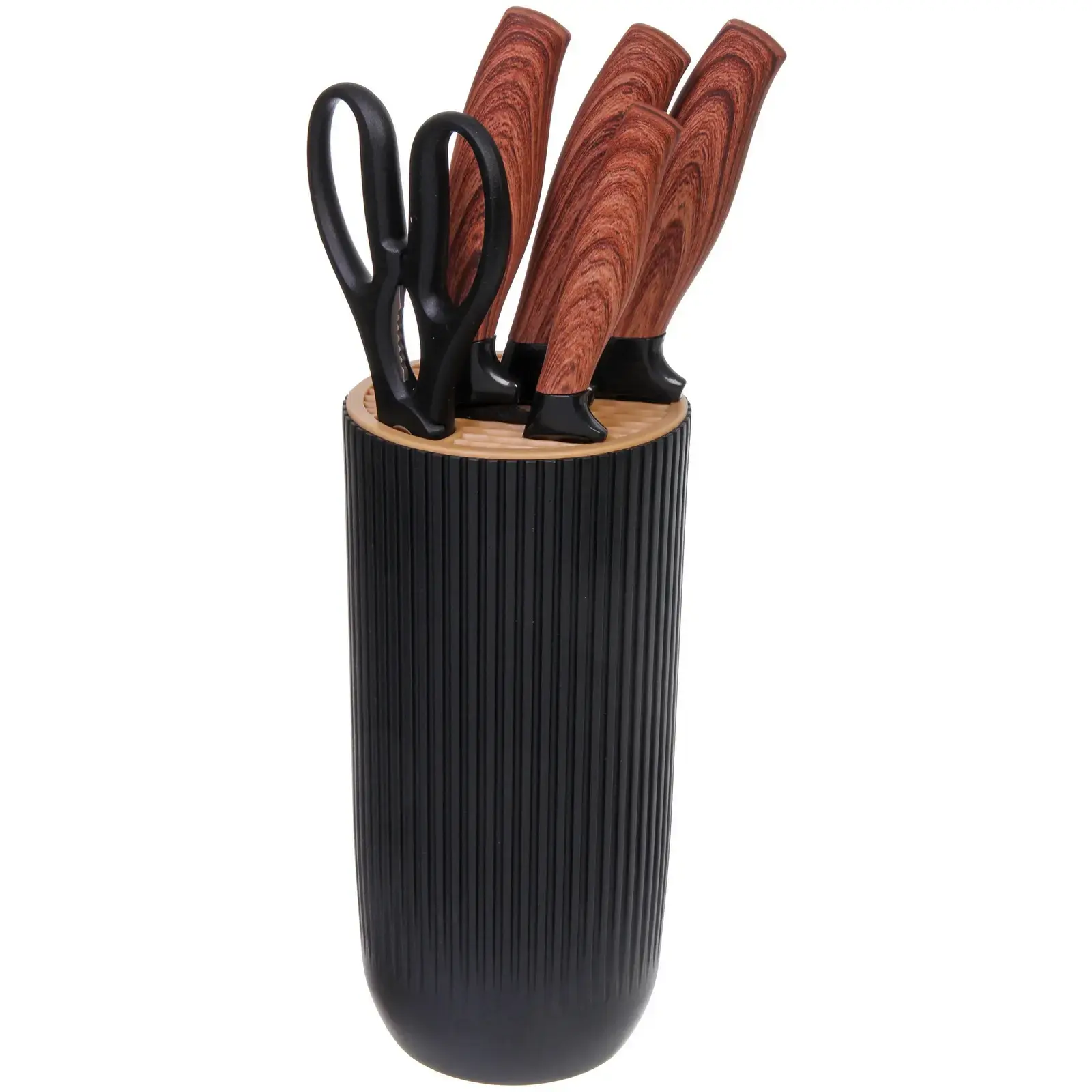 Каждый нож в наборе имеет свои размеры и предназначение, что делает его универсальным инструментом для нарезки, шинковки и других кухонных задач. Подставка выполнена из прочного черного материала с рифленой текстурой, что добавляет стильный акцент в интерьер вашей кухни. Ножницы, входящие в комплект, также имеют удобные ручки и предназначены для резки различных материалов.