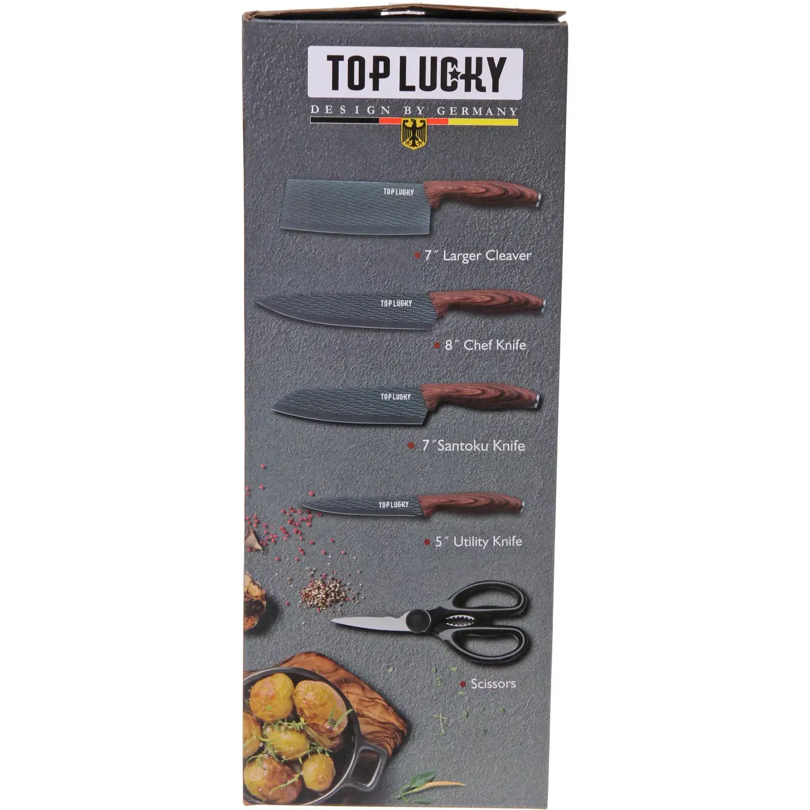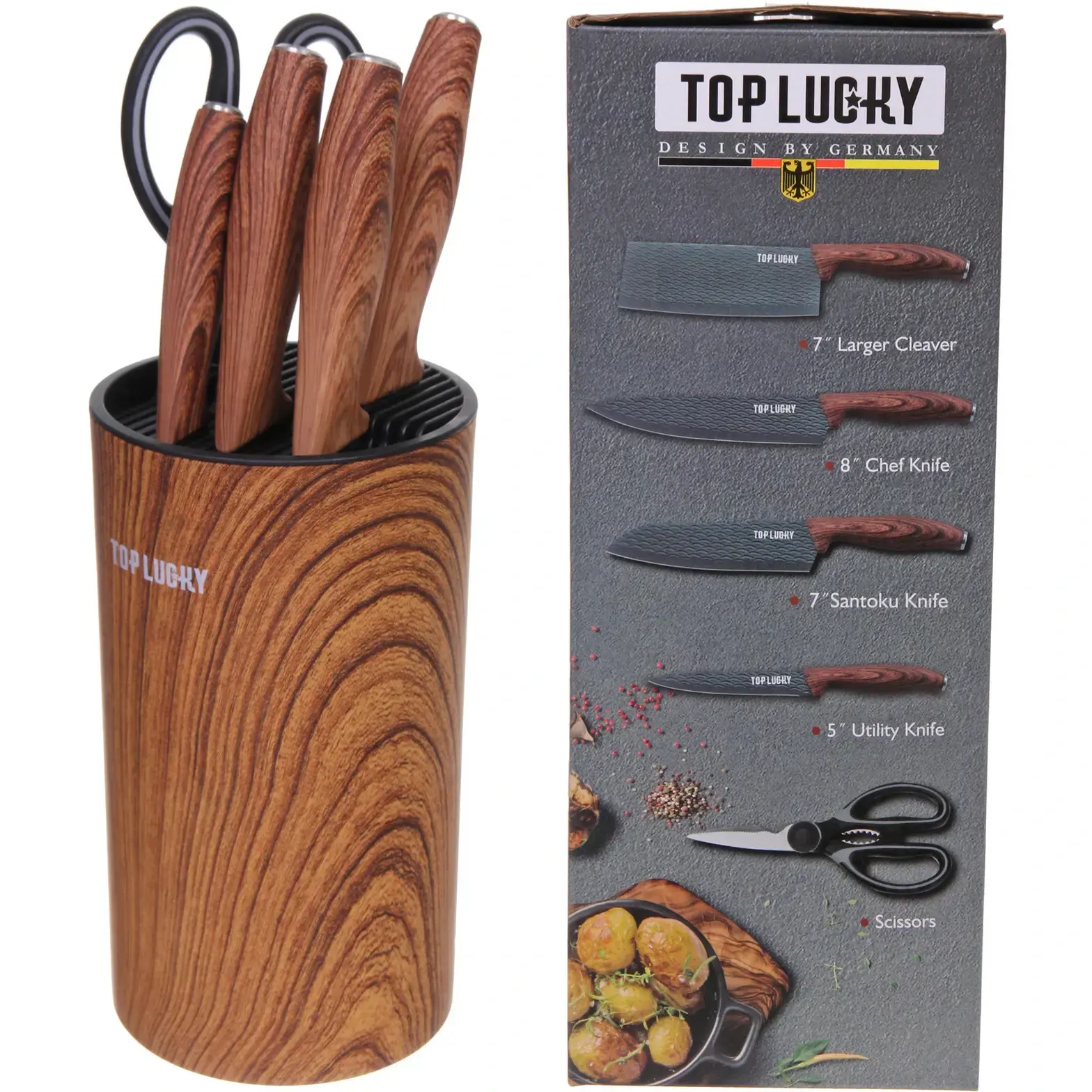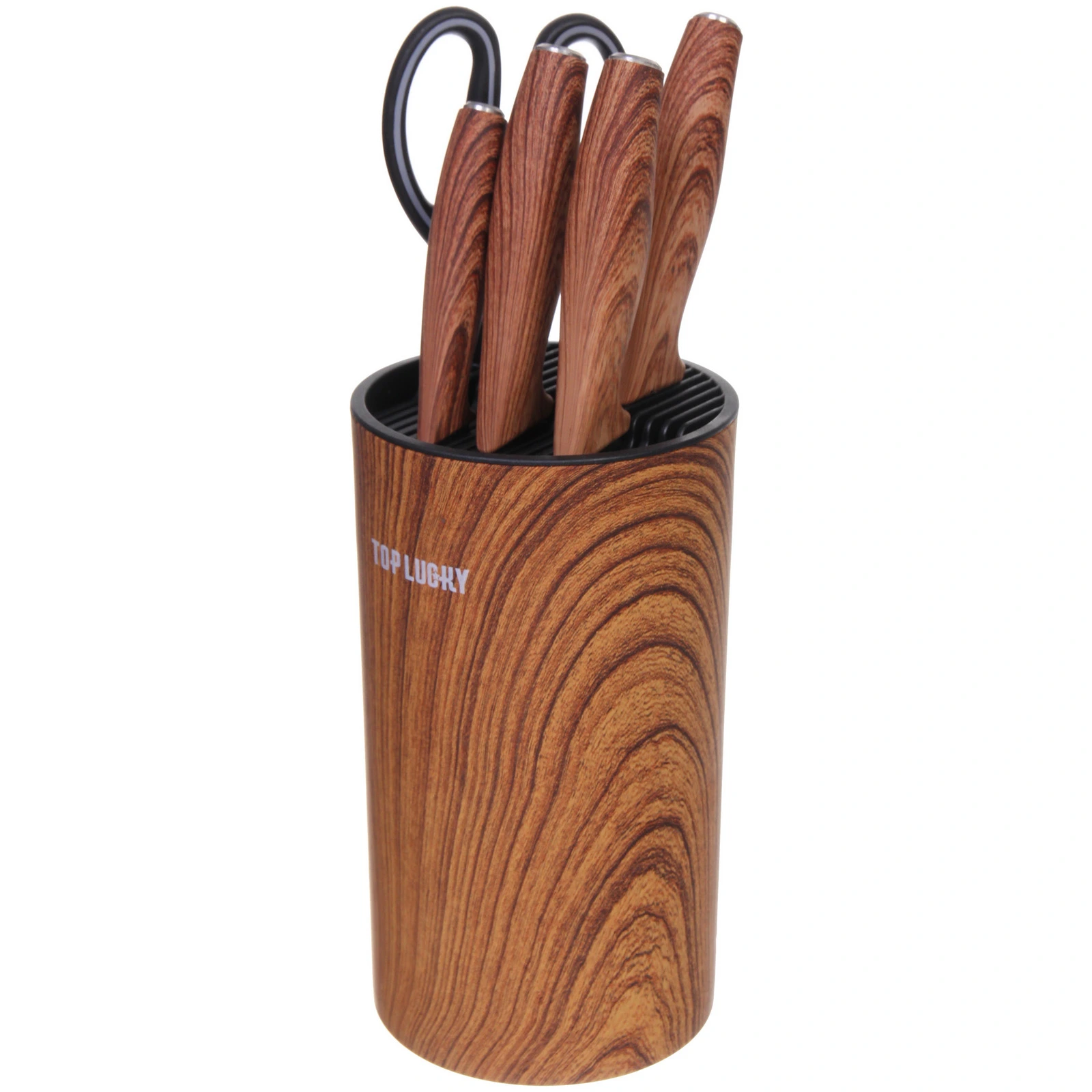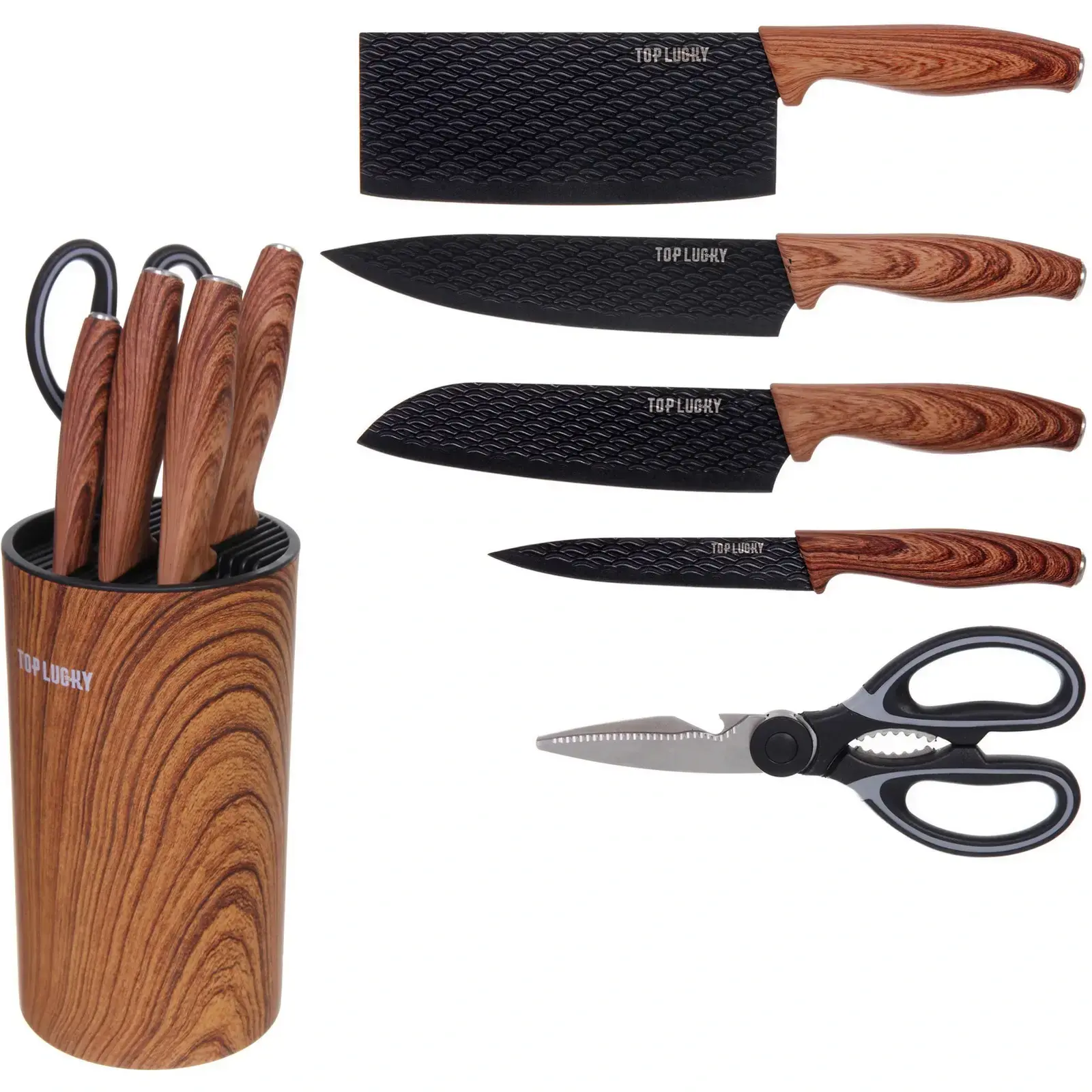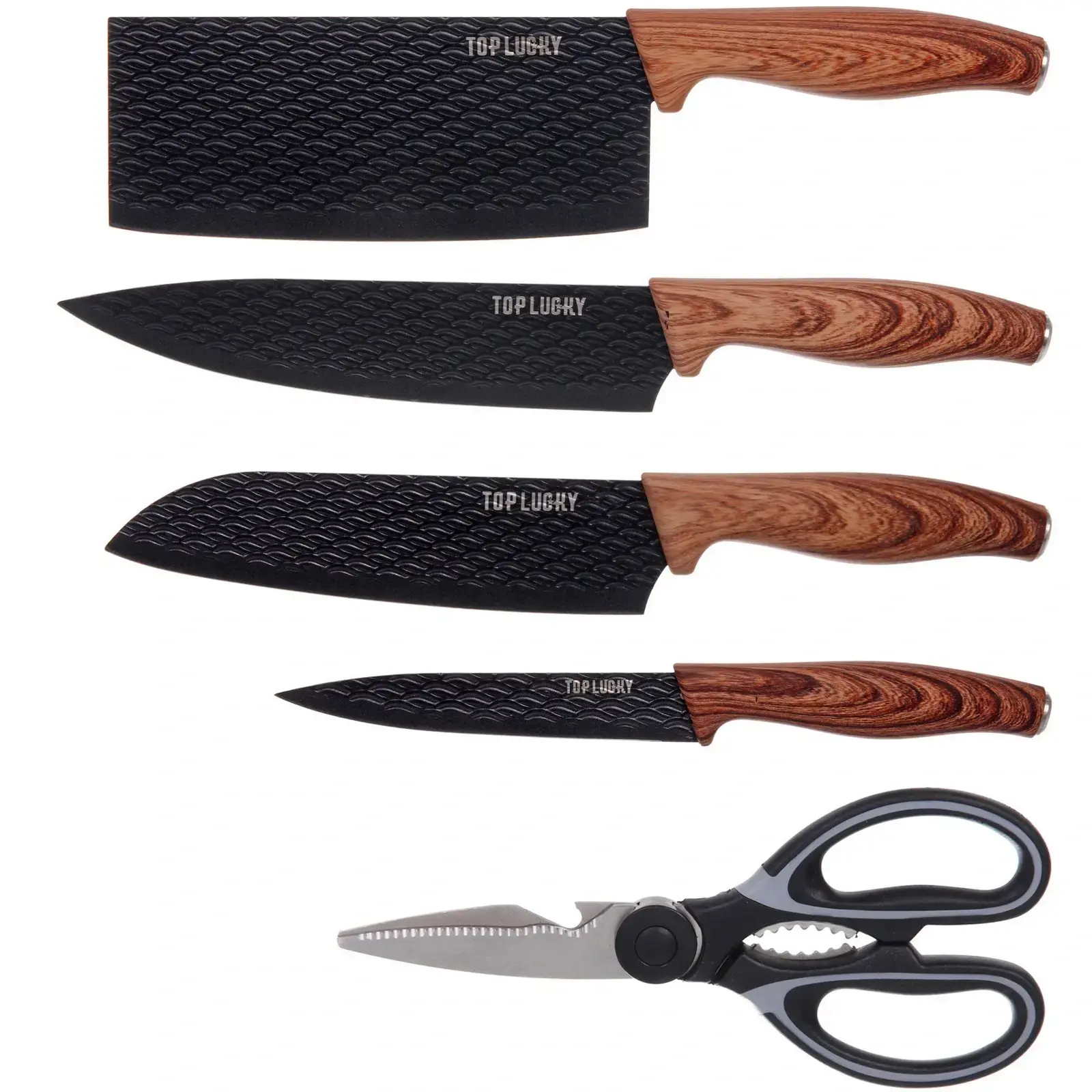 Размеры ножей идеально подходят для домашнего использования, а ножницы с черной ручкой дополняют набор, позволяя выполнять дополнительные задачи. Набор ножей «TOP LUCKY» станет отличным подарком для любителей готовить и тех, кто хочет улучшить свои кулинарные навыки.