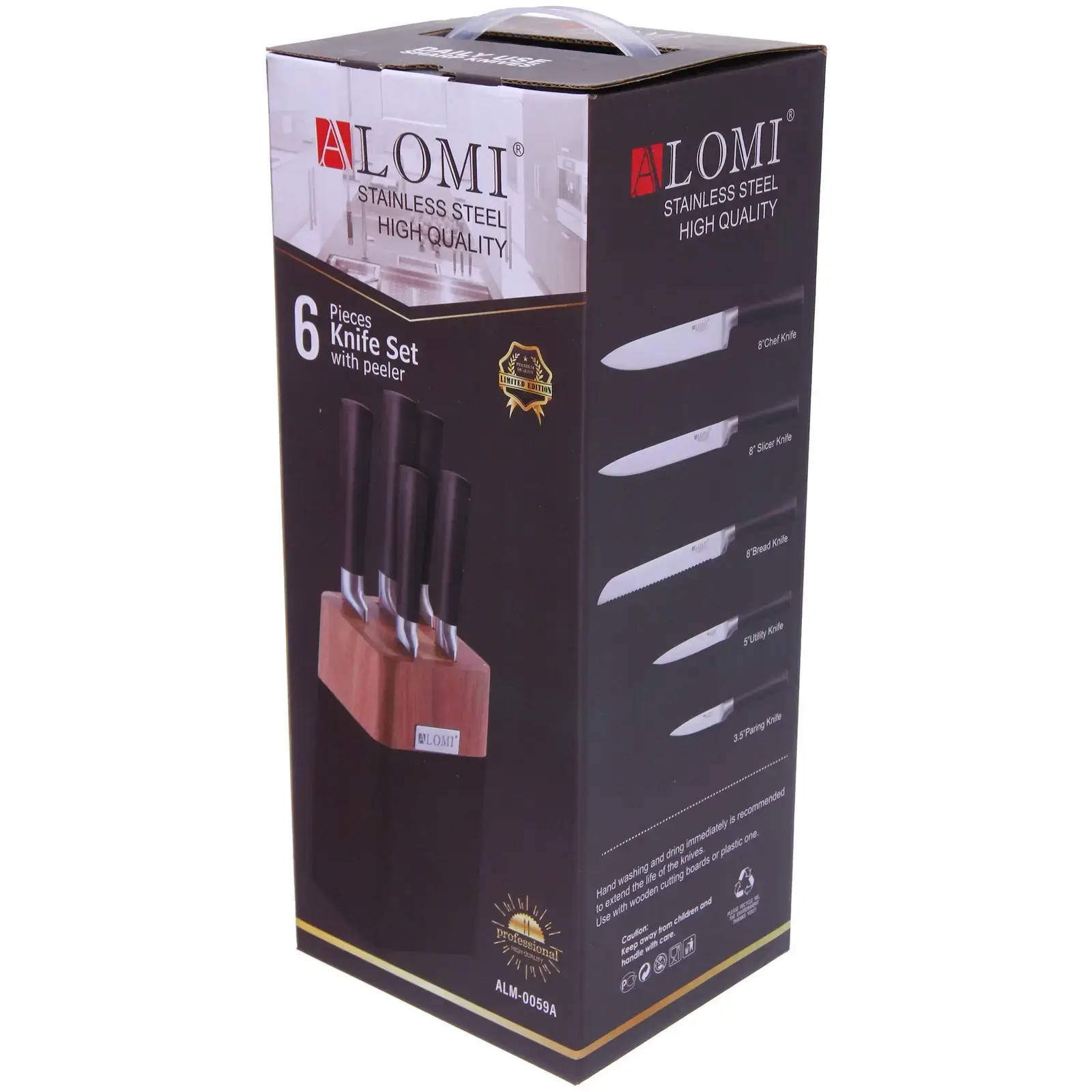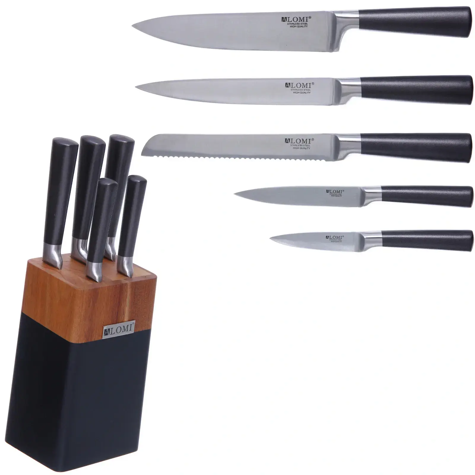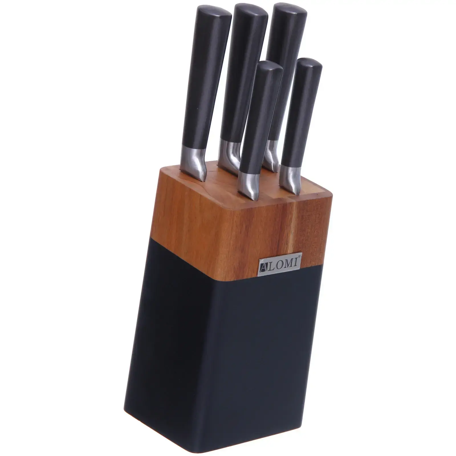Набор включает в себя 5 ножей и удобную подставку, которая обеспечивает безопасное хранение и предотвращает повреждение лезвий. Подставка выполнена из дерева и имеет стильный черный пластиковый основание, что делает её не только практичной, но и эстетически привлекательной. Ножи имеют черные пластиковые рукоятки, которые обеспечивают надежный и удобный захват, а металлические лезвия гарантируют долговечность и остроту на протяжении долгого времени.