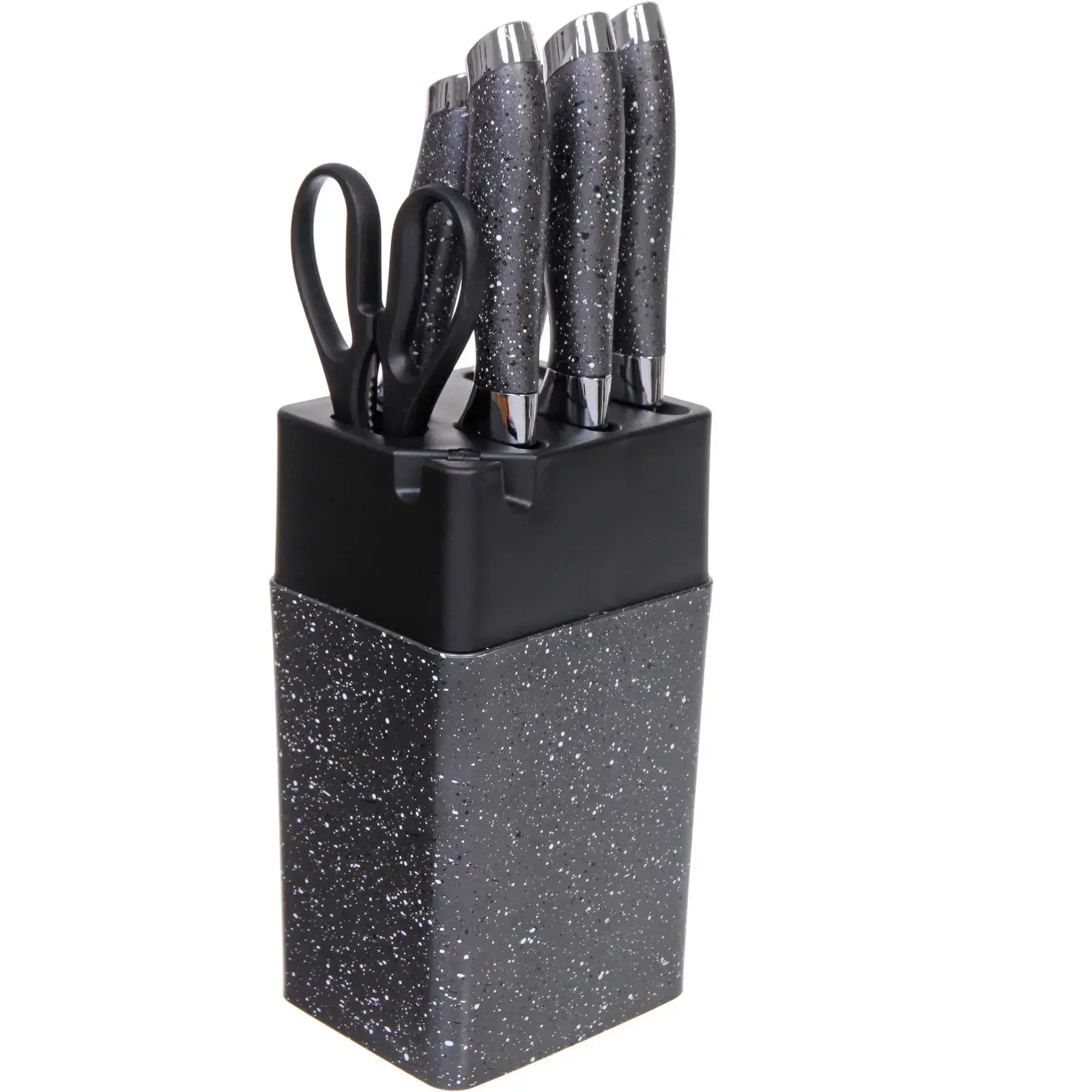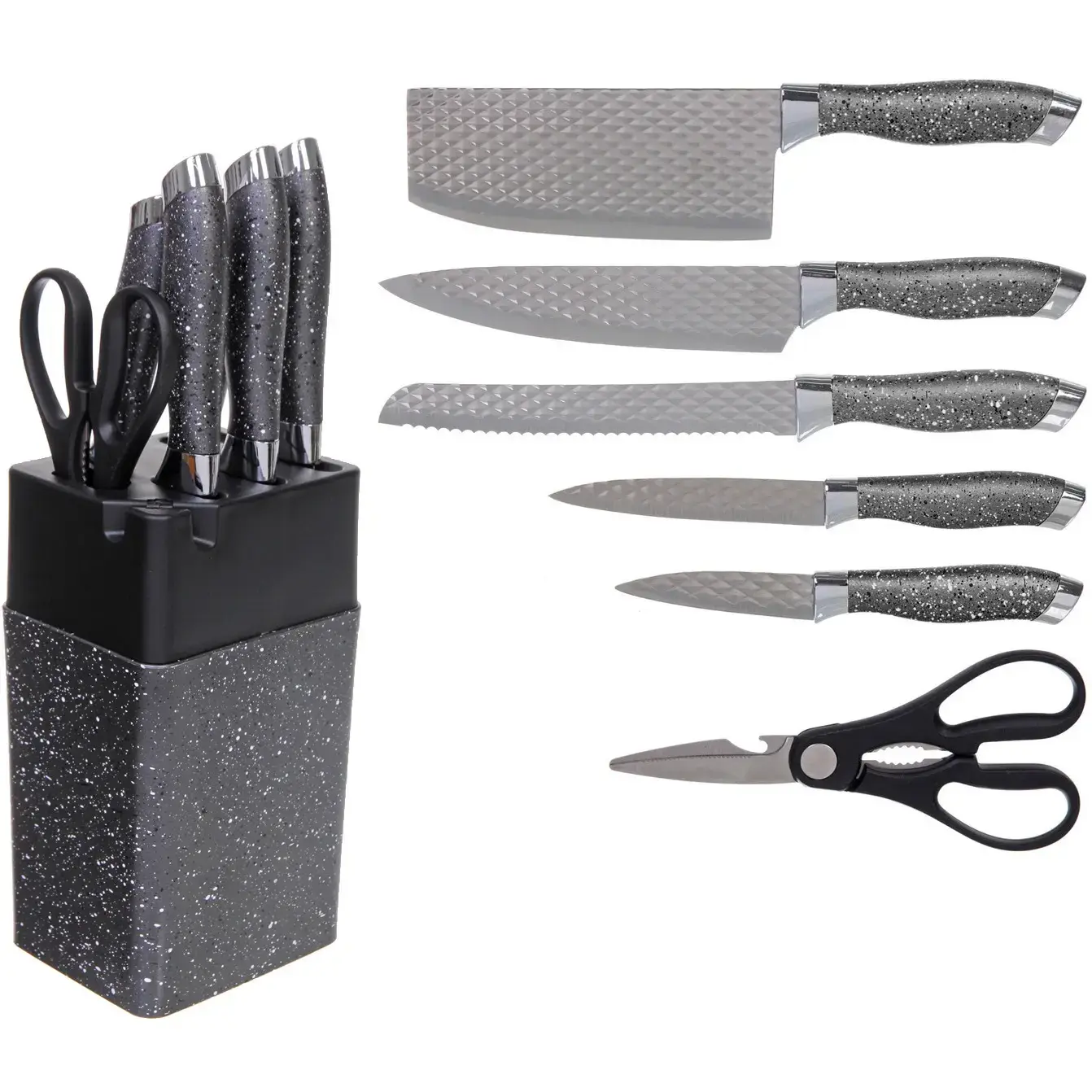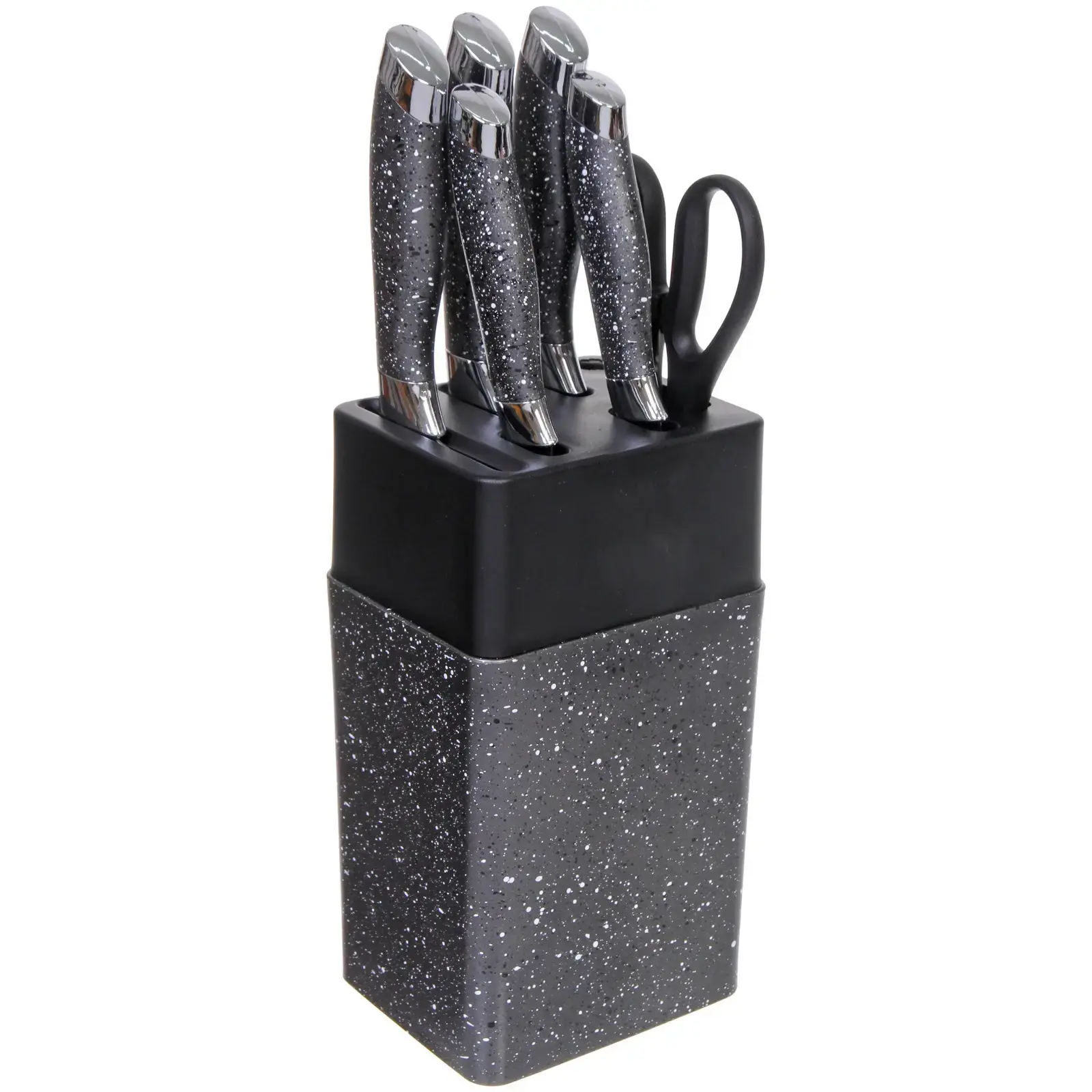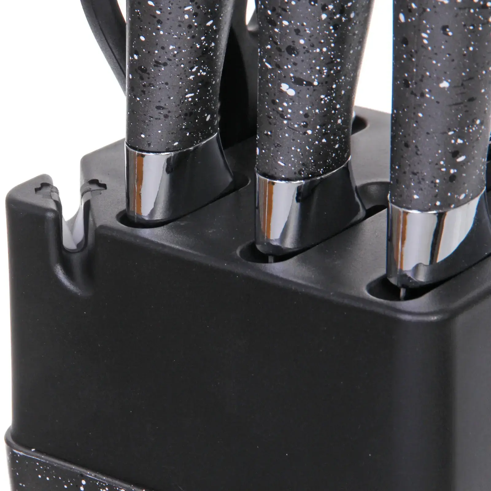 Ножи выполнены из высококачественного металла, что обеспечивает их долговечность и надежность. Ручки ножей имеют текстурированное покрытие, что предотвращает скольжение и обеспечивает надежный захват. Подставка выполнена из прочного пластика, что делает ее легкой и устойчивой. Размеры ножей варьируются, что позволяет использовать их для различных кулинарных задач. Набор «SHEF» — это идеальное решение для тех, кто ценит качество и удобство в приготовлении пищи.