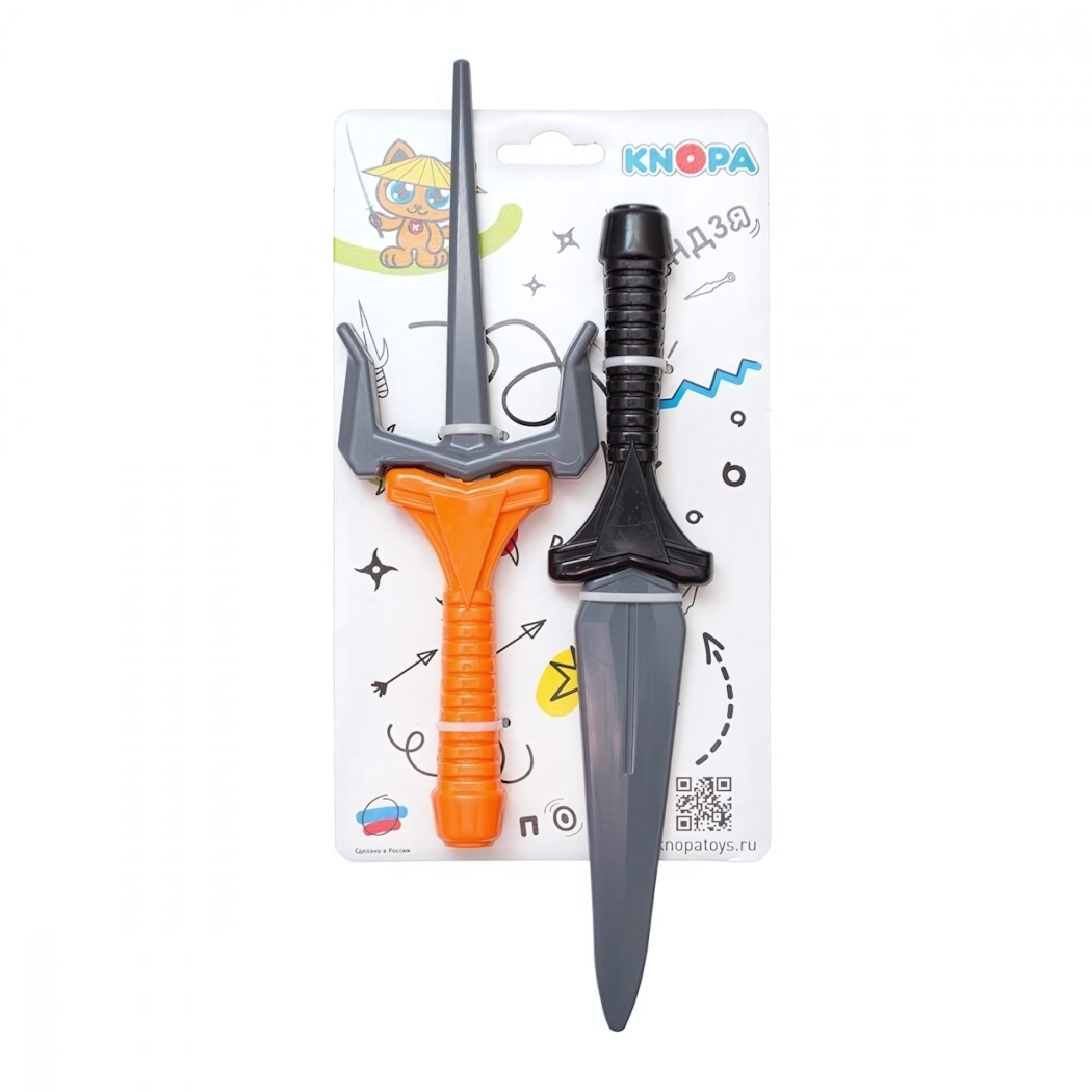 Два эффектных меча разных моделей: изогнутый саи в оранжево-серой гамме и прямой кинжал в черном цвете. Игрушки упакованы на плотную картонную подложку с ярким дизайном, готовы к использованию сразу после распаковки.