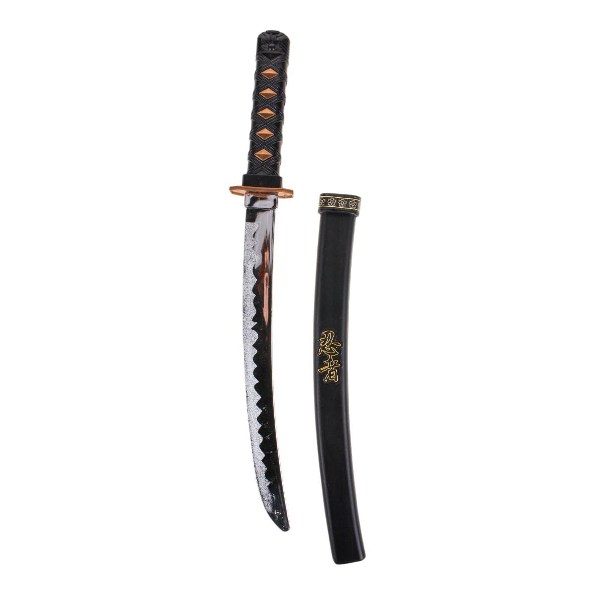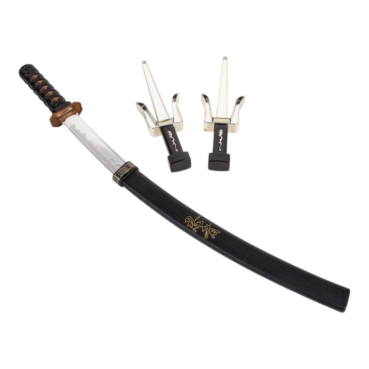 - Катана с ножнами – изогнутый меч с волнистой серебристой кромкой клинка и удобной чёрной рукоятью. Ножны с золотистыми символами позволяют безопасно носить оружие за спиной.