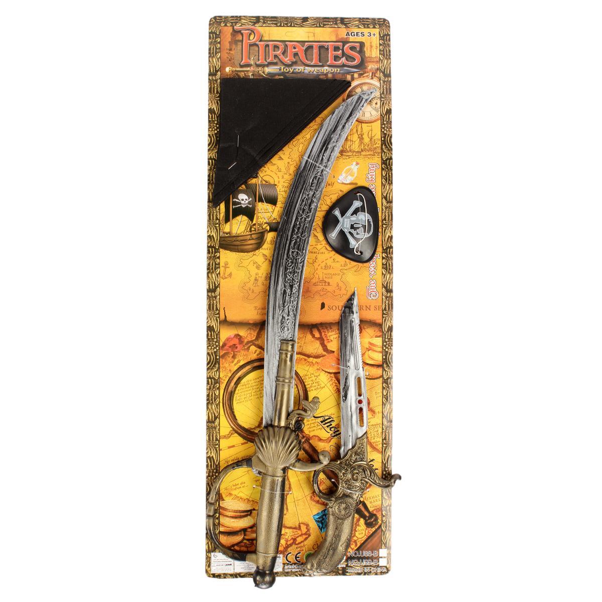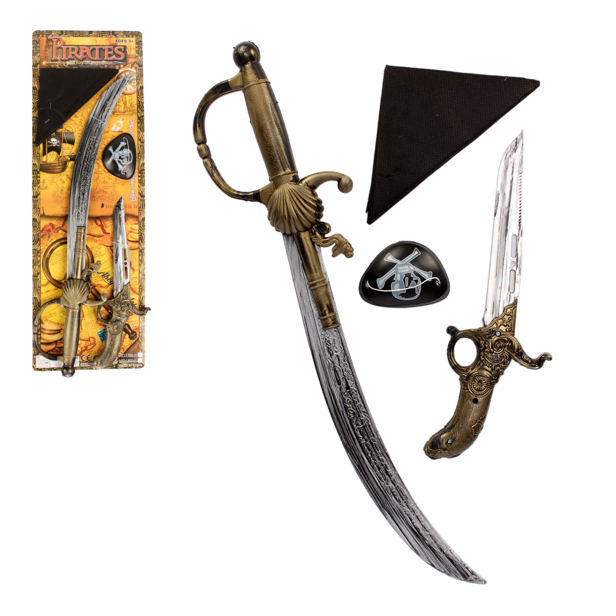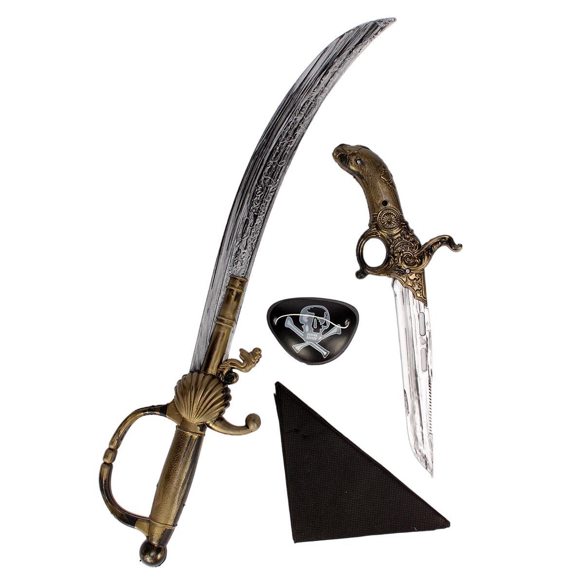 В набор входят: меч, кинжал, повязка на глаз и бандана. Все элементы выполнены из безопасного пластика, что делает их легкими и удобными для использования. Набор подходит для детей от 3 лет и станет отличным подарком на день рождения или праздник.