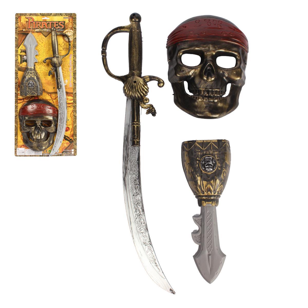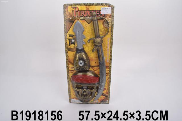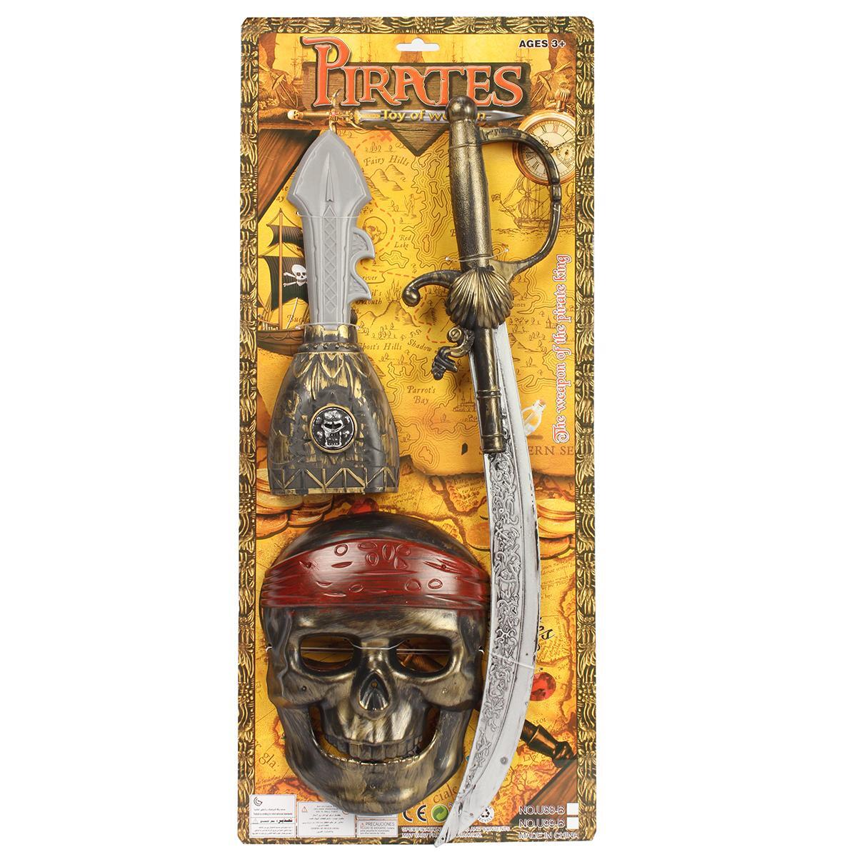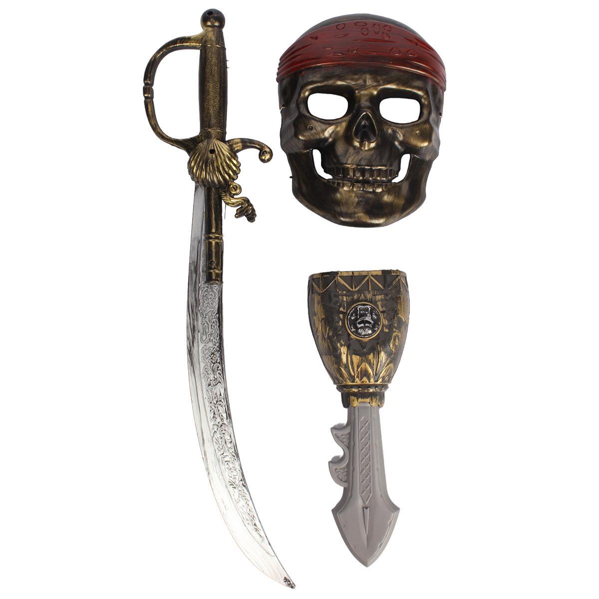 Каждый элемент набора тщательно продуман и выполнен с учетом детских потребностей. Сабля имеет изогнутую форму и украшена декоративными узорами, а маска выполнена в виде черепа с красной банданой, что добавляет атмосферности игре. Кинжал также имеет интересный дизайн, что делает набор не только игровым, но и эстетически привлекательным.