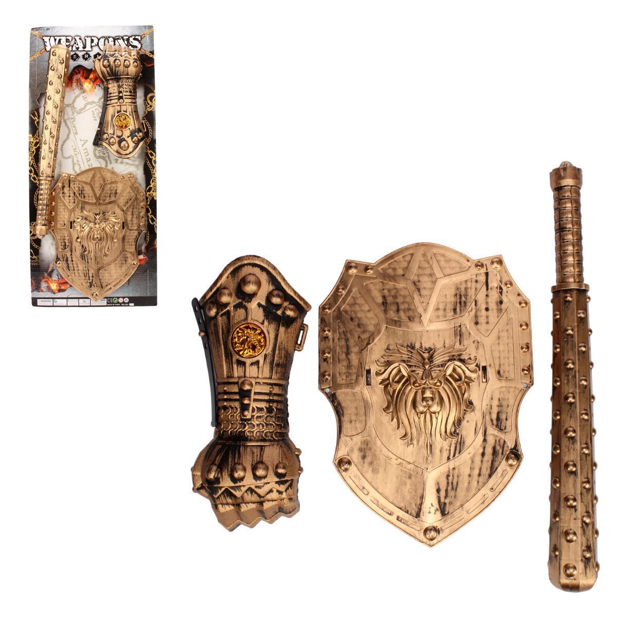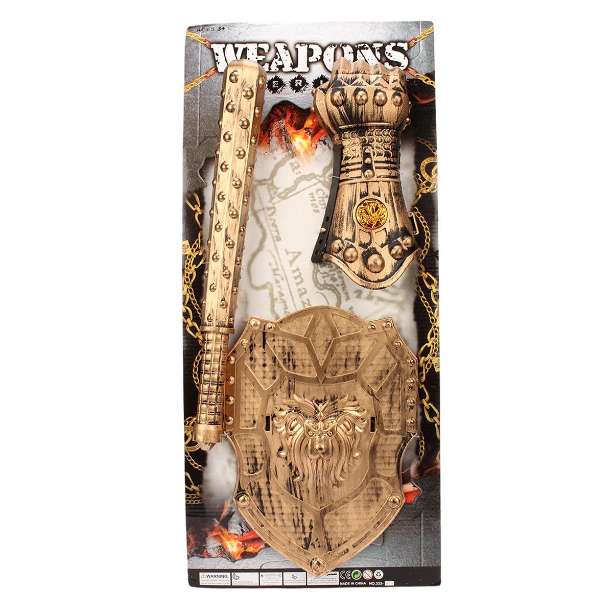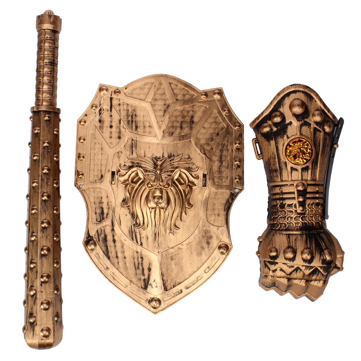 Этот набор оружия рыцаря станет идеальным подарком для вашего ребенка, который мечтает о приключениях и сражениях. Он включает в себя три предмета: щит, перчатку и дубинку, выполненные из прочного пластика. Яркий золотистый цвет и детализированный дизайн делают эти игрушки не только красивыми, но и увлекательными для игры.