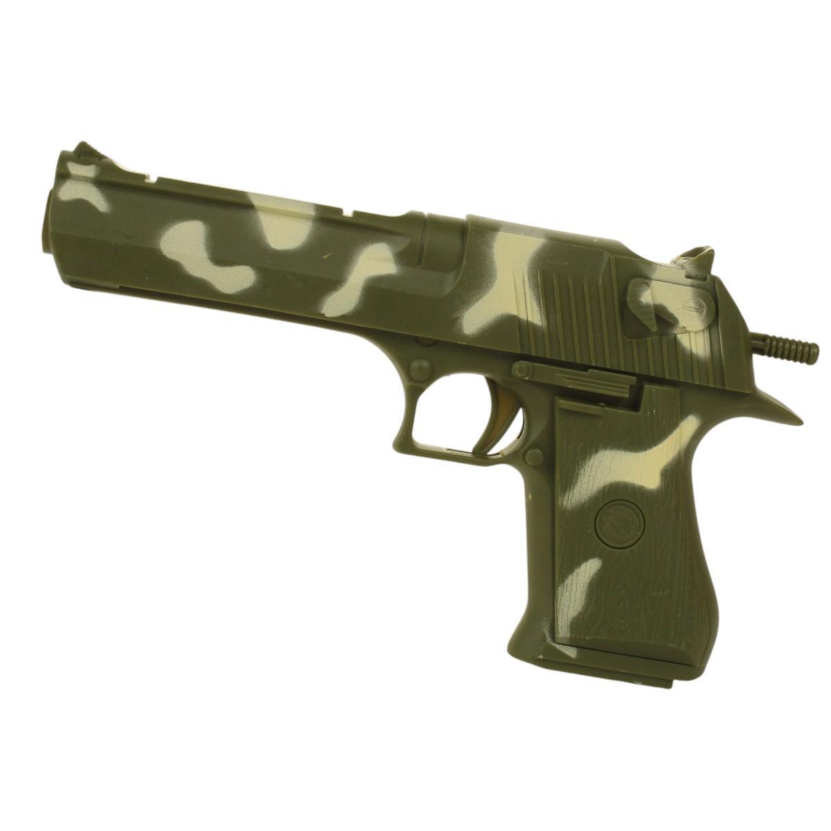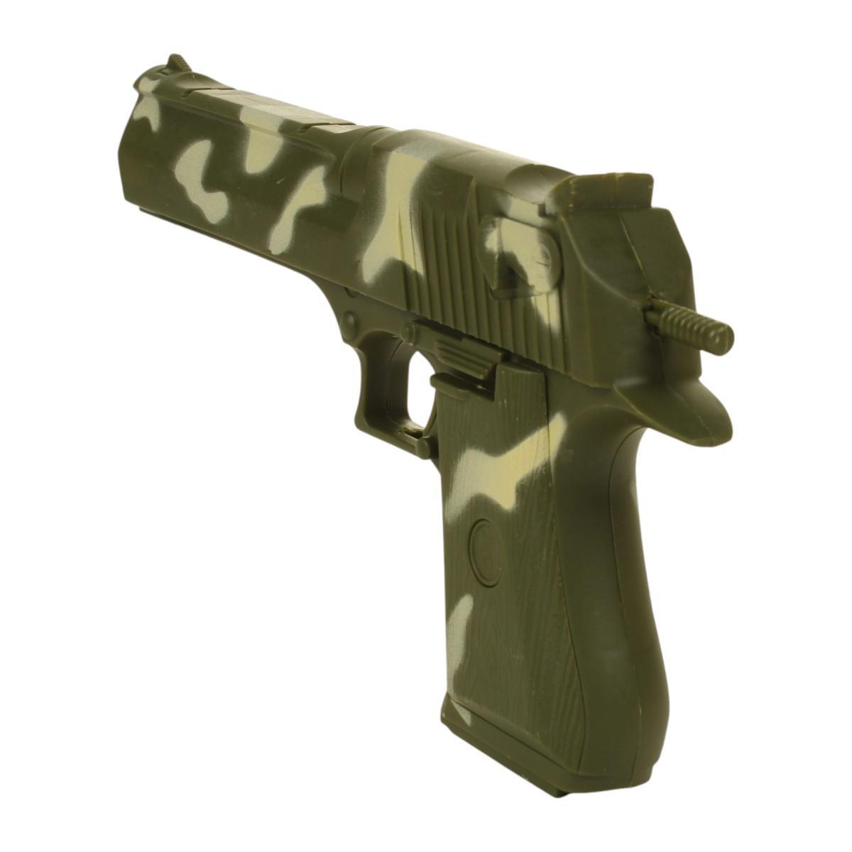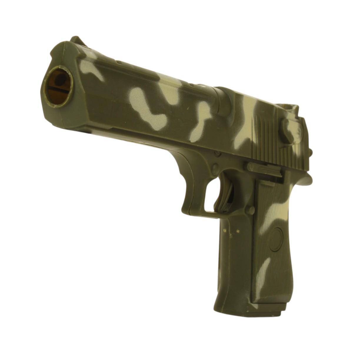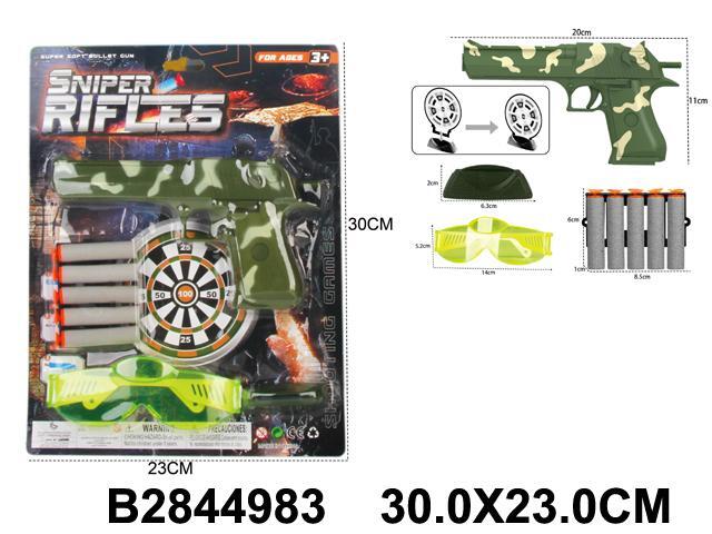 В комплект входят все необходимые элементы для игры: игрушечный пистолет длиной 20 см, мишень диаметром 30 см, защитные очки и 5 софт-патронов. Пистолет выполнен в стильном камуфляжном дизайне, что добавляет реалистичности игре. Мишень с разделенными секторами позволяет организовать соревнования на точность, а защитные очки обеспечивают безопасность во время игры.