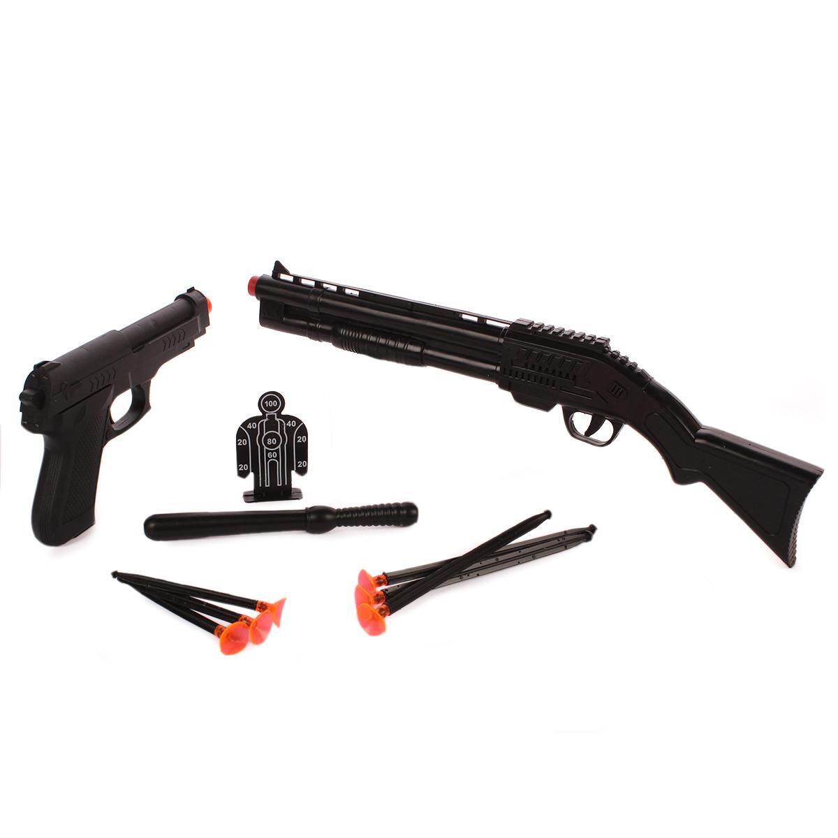 Этот набор игрушечного оружия создан для настоящих защитников правопорядка. В комплекте все необходимое для увлекательных игр: детализированная винтовка, пистолет, полицейская дубинка, три мишени и присоски.